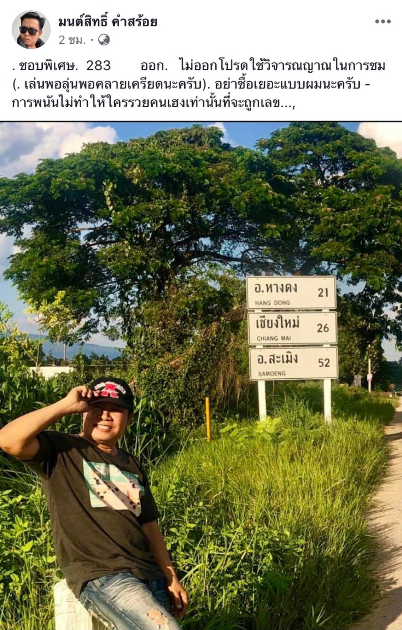 โดยครั้งนี้ มนต์สิทธิ์ได้โพสต์รูปตัวเองถ่ายคู่กับป้ายบอกทาง ที่เขียนว่า อ.หางดง 21 เชียงใหม่ 26 อ.สะเมิง 52 พร้อมแคปชั่นว่า “ชอบพิเศษ 283 ออกไม่ออก โปรดใช้วิจารณญาณในการชม (เล่นพอลุ้นพอคลายเครียดนะครับ) อย่าซื้อเยอะแบบผมนะครับ การพนันไม่ทำให้ใครรวย คนเฮงเท่านั้นที่จะถูกเลข”