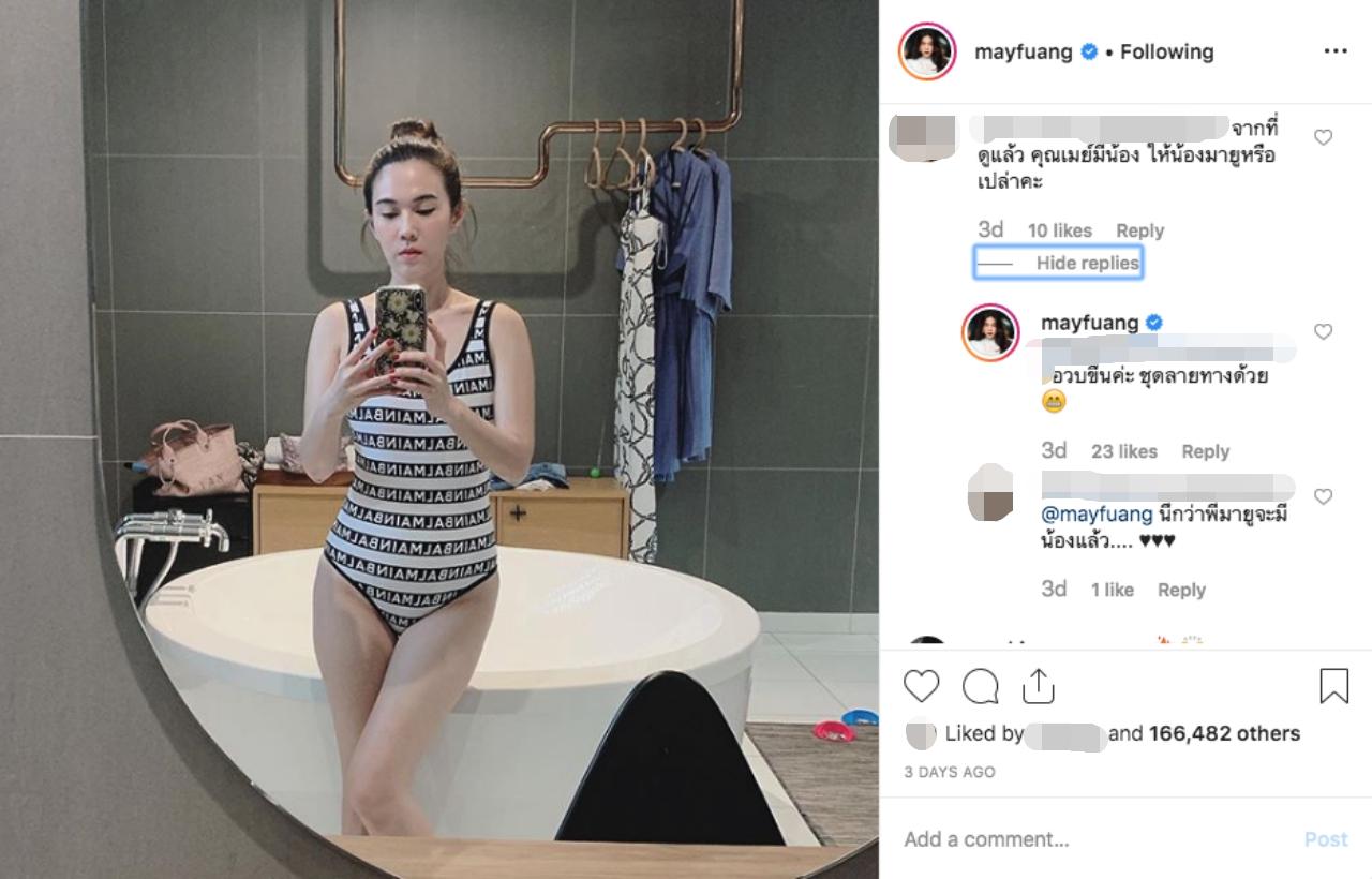 และล่าสุดก็เช่นกัน เมื่อ เมย์ ได้ลงรูปในชุดว่ายน้ำที่เธอยืนถ่ายอยู่หน้ากระจก ก็ได้มีคนที่ติดตามเกิดข้อสงสัยและเข้ามาถามเธอว่า ท้องรึเปล่า "จากที่ดูแล้ว คุณเมย์มีน้อง ให้น้องมายูหรือเปล่าคะ" และ เมย์ ก็ได้เข้ามาตอบอย่างชัดเจนว่า "อวบขึ้นค่ะ ชุดลายทางด้วย"