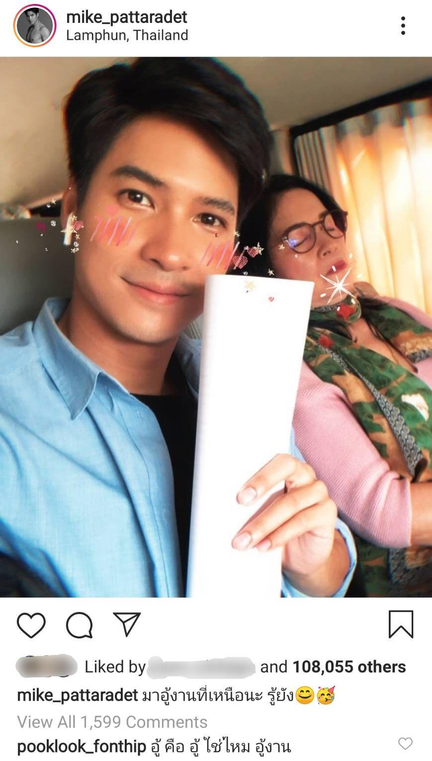 ล่าสุด ไมค์ โพสต์ภาพตอนไปทำงานที่ จ.ลำพูน พร้อมทั้งเขียนแคปชั่น “มาอู้งานที่เหนือนะ รู้ยัง” และมีแฟนๆ เข้ามาคอมเมนต์ชมน่ารักและบอกให้สู้ๆ แต่ดราม่าก็เกิดขึ้นเมื่อนางเอกสาว ปุ๊กลุก ฝนทิพย์ วัชรตระกูล ที่ตกเป็นข่าวกุ๊กกิ๊กกับ ไมค์ มานานหลายปี เข้ามาคอมเมนต์แซวว่า “อู้ คือ อู้ ใช่ไหม อู้งาน”