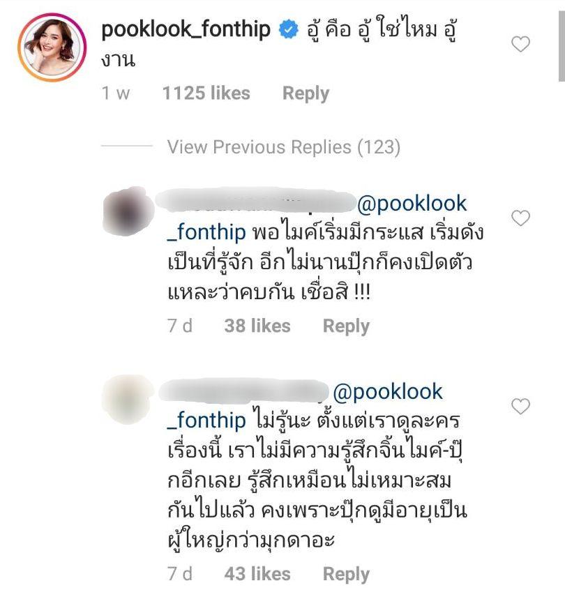 ซึ่งก็มีแฟนๆ หลายคนเข้ามาแซว ปุ๊กลุก ที่คอมเมนต์แซว ไมค์ แต่ก็มีบางคนที่อินกับคู่ ไมค์-มุกดา มาก เข้ามาเชียร์ให้ ไมค์ จีบ มุกดา ใต้คอมเมนต์แซวของ ปุ๊กลุก บ้างก็บอกว่าไม่อินกับ ไมค์-ปุ๊กลุก และมีบางคนวิจารณ์ ปุ๊กลุก ว่า “พอไมค์เริ่มมีกระแส เริ่มดัง เป็นที่รู้จัก อีกไม่นานปุ๊กก็คงเปิดตัวแหละว่าคบกัน เชื่อสิ!!!” กลายเป็นดราม่าเถียงกันยาวเหยียดนับร้อยข้อความ