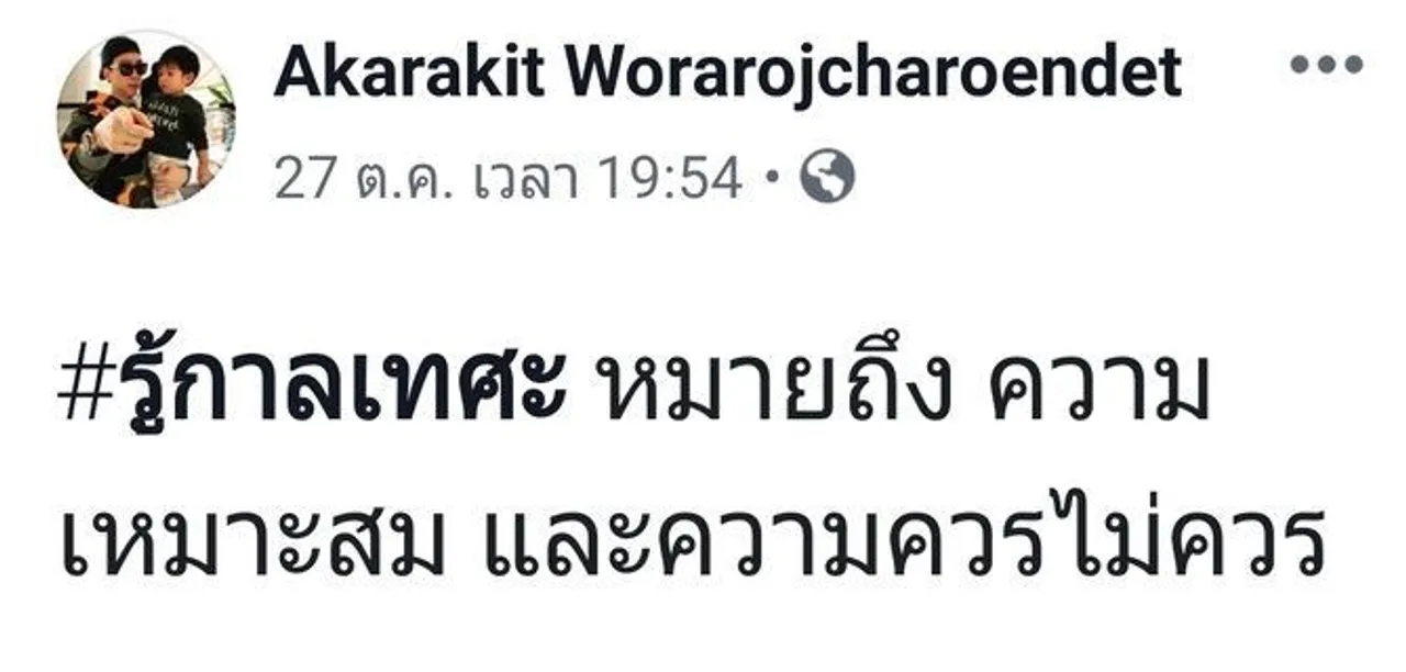 ทำเอาหลายคนสงสัยว่านักแข่งรถหนุ่ม เบนซ์ อัครกิตติ์ วรโรจน์เจริญเดช หรือ เบนซ์ เรซซิ่ง มีเรื่องอะไรในใจรึเปล่า หลังเจ้าตัวโพสต์ข้อความดราม่าในเฟซบุ๊กส่วนตัวว่า “#รู้กาลเทศะ หมายถึง ความเหมาะสม และความควรไม่ควร” งานนี้อดีตภรรยาอย่างนักแสดง-พิธีกรสาวอารมณ์ดี แพท ณปภา ตันตระกูล เลยถูกโยงถึงเรื่องนี้ เพราะก่อนหน้านี้ แพท เพิ่งให้พิธีกร-นักร้องหนุ่ม โอ๊ต ปราโมทย์ ปาทาน ไปรับลูกชาย น้องเรซซิ่ง ที่โรงเรียนด้วยกันพอดี พอนักข่าวได้เจอ แพท มาร่วมงาน “ผู้หญิงยกกำลังแจ๋ว แฟร์ยกกำลังว้าว” ณ ศูนย์การค้าเซ็นทรัลพลาซ่าเวสต์เกต เลยถามถึงเรื่องดังกล่าว รวมทั้งถามถึงพัฒนาการของ น้องเรซซิ่ง ด้วย