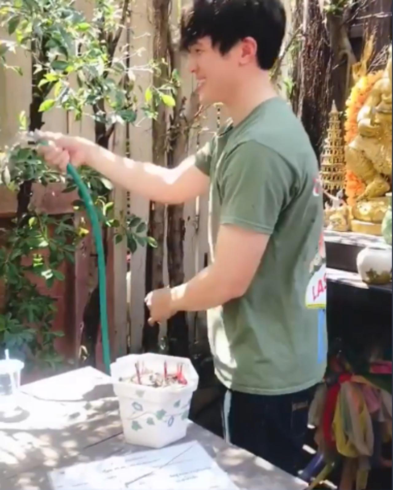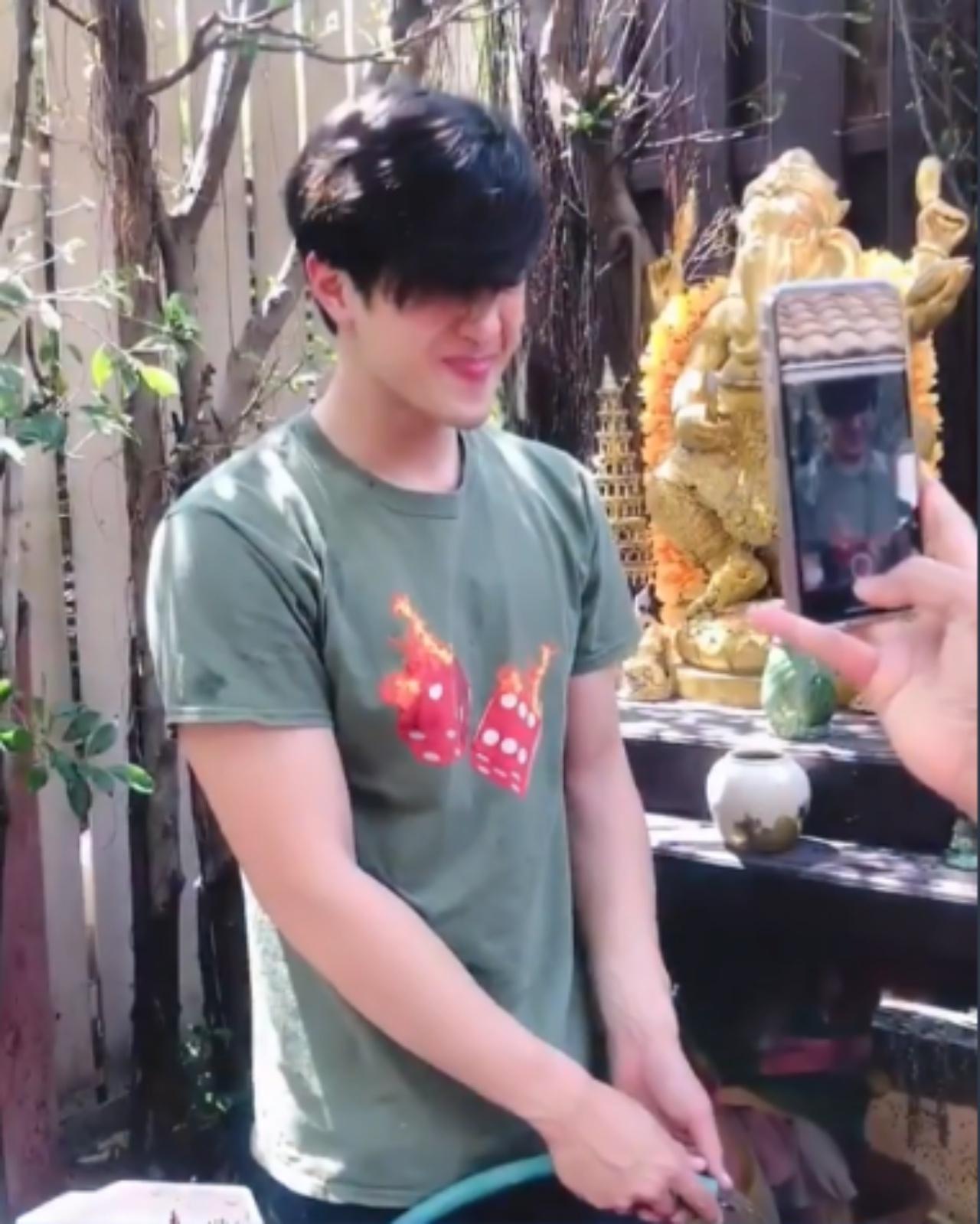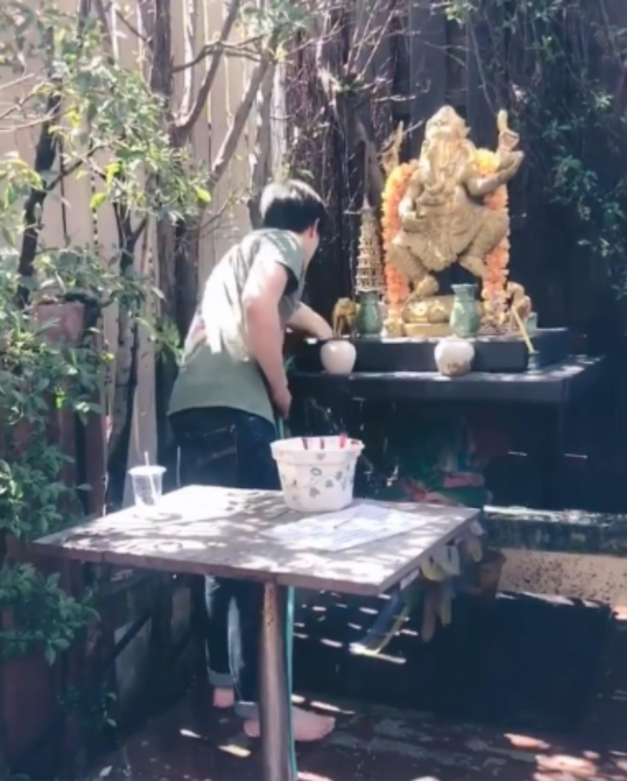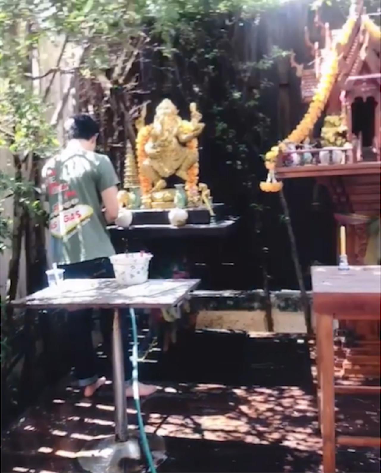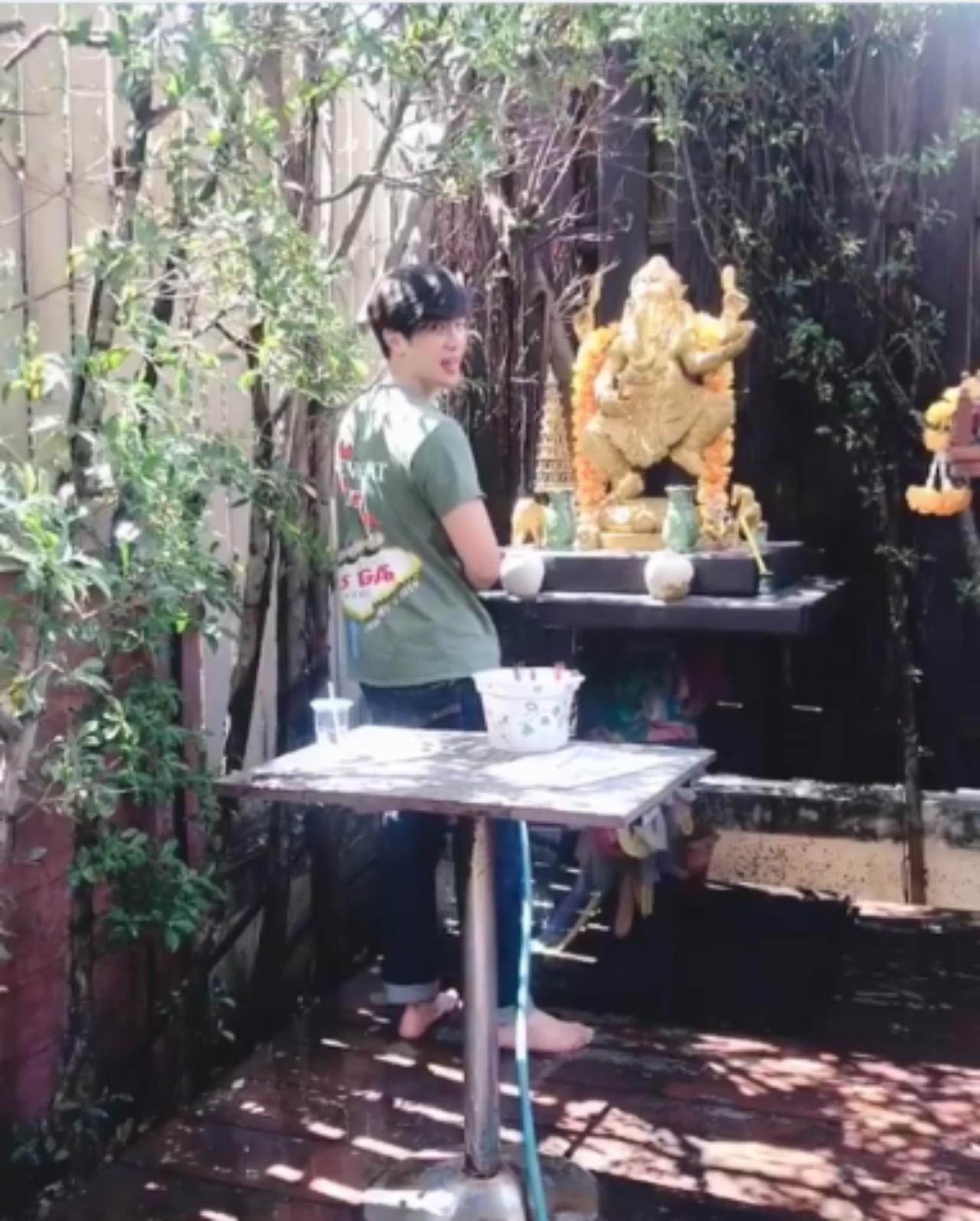 แต่ตอนที่พี่เอขึ้นบ้านใหม่ ท่านพราหมณ์เหมือนหันมาพูดกับผมว่า ให้ผมมากวาดมาดูแลศาลพระภูมิทุกอาทิตย์ ตอนนั้นยังไม่มีงาน ก่อนไปเรียนก็มาทำเรื่อยๆ ทำจนวันหนึ่งพอเราเริ่มได้ถ่ายละครแล้ว เราก็เลยอธิษฐานจิตบอกท่านว่า ทุกครั้งที่ผมกลับไปบ้านพี่เอ เราจะทำเหมือนเดิม