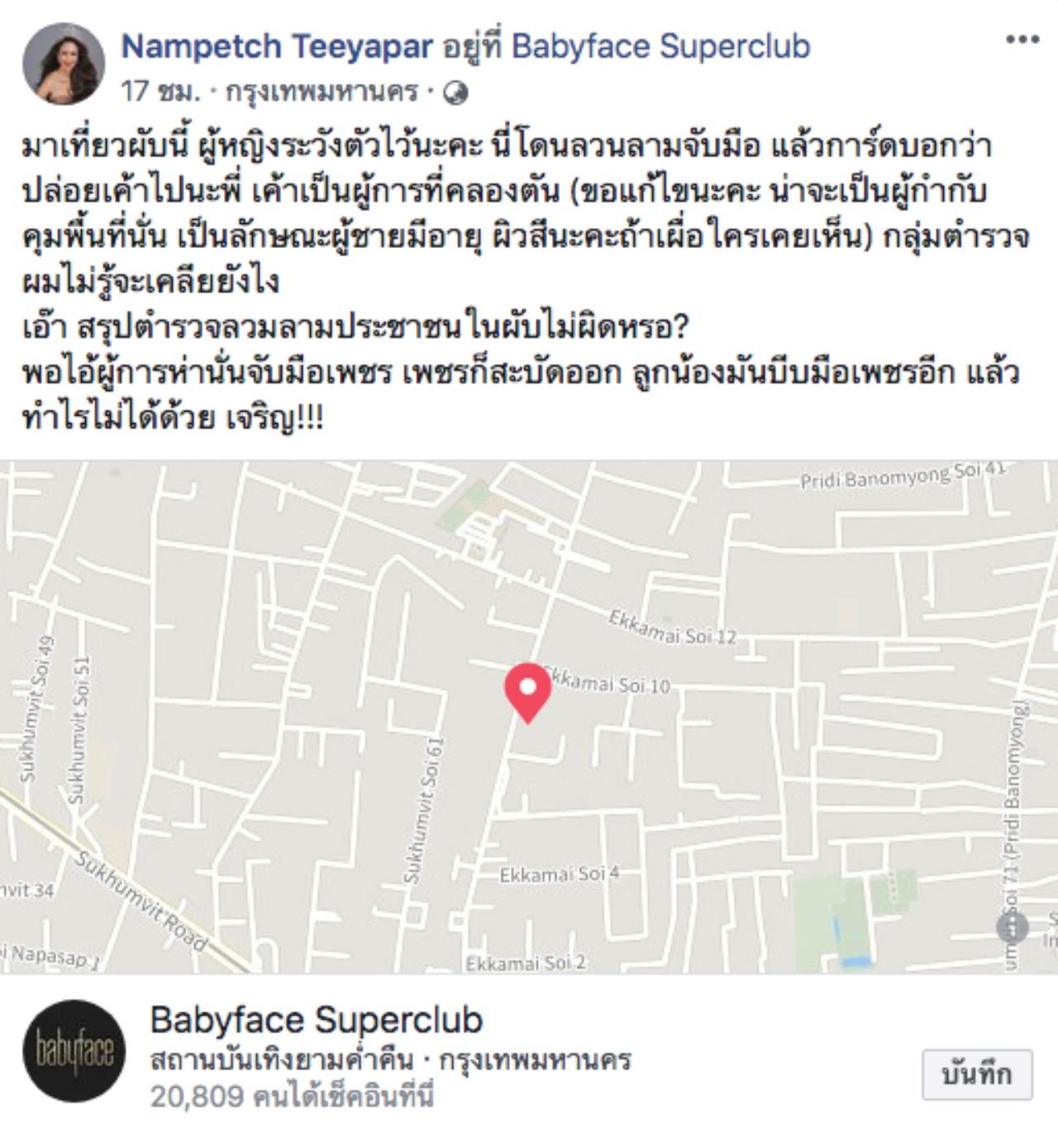 "มาเที่ยวผับนี้ ผู้หญิงระวังตัวไว้นะคะ นี่โดนลวนลามจับมือ แล้วการ์ดบอกว่า ปล่อยเค้าไปนะพี่ เค้าเป็นผู้การที่คลองตัน (ขอแก้ไขนะคะ น่าจะเป็นผู้กำกับ คุมพื้นที่นั่น เป็นลักษณะผู้ชายมีอายุ ผิวสีนะคะถ้าเผื่อใครเคยเห็น) กลุ่มตำรวจผมไม่รู้จะเคลียร์ยังไง