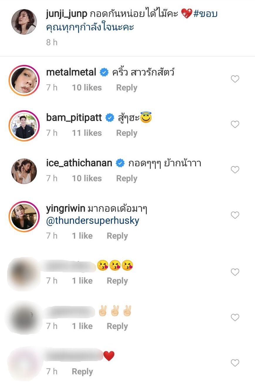 โดยนอกจากจะมีแฟนๆ เข้ามาให้กำลังใจกันเพียบแล้ว ยังมีคนบันเทิงคอมเมนต์ให้กำลังใจหลายคน อาทิ ไอซ์ อธิชนัน, หญิง สุกัญญา, แบม ปิติภัทร รวมไปถึง เมทัล สุขขาว ที่เข้ามาคอมเมนต์ชมว่าเป็นสาวรักสัตว์ด้วย.