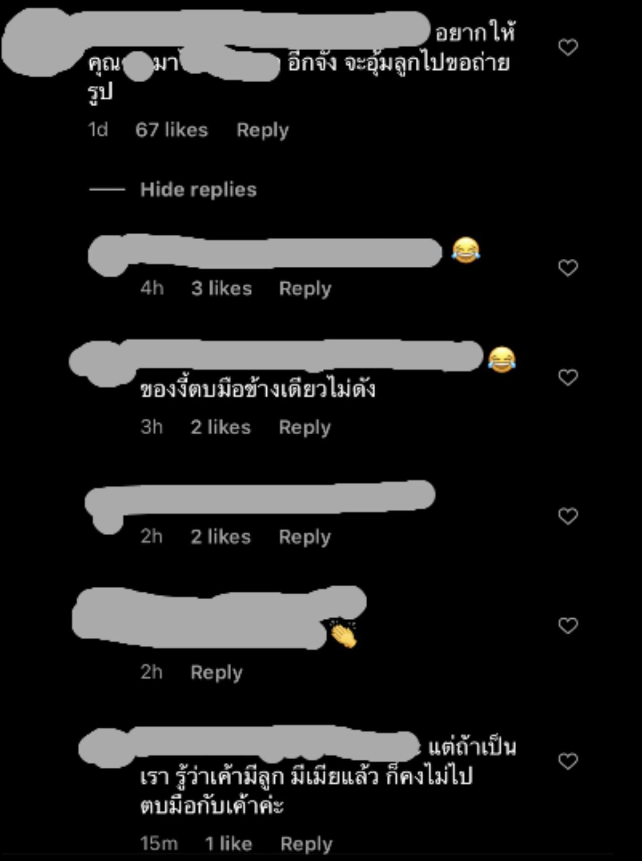 บางก็ว่า "ของอย่างนี้ตบมือข้างเดียวไม่ดัง" แต่ก็มีฝั่งคิดต่างบอกว่า "รู้ว่าเค้ามีลูกมีเมียแล้วก็คงไม่ควรไปตบมือกับเค้าค่ะ" ซึ่งไม่นานนักร้องสาวก็ลบข้อความดังกล่าวทิ้งไป