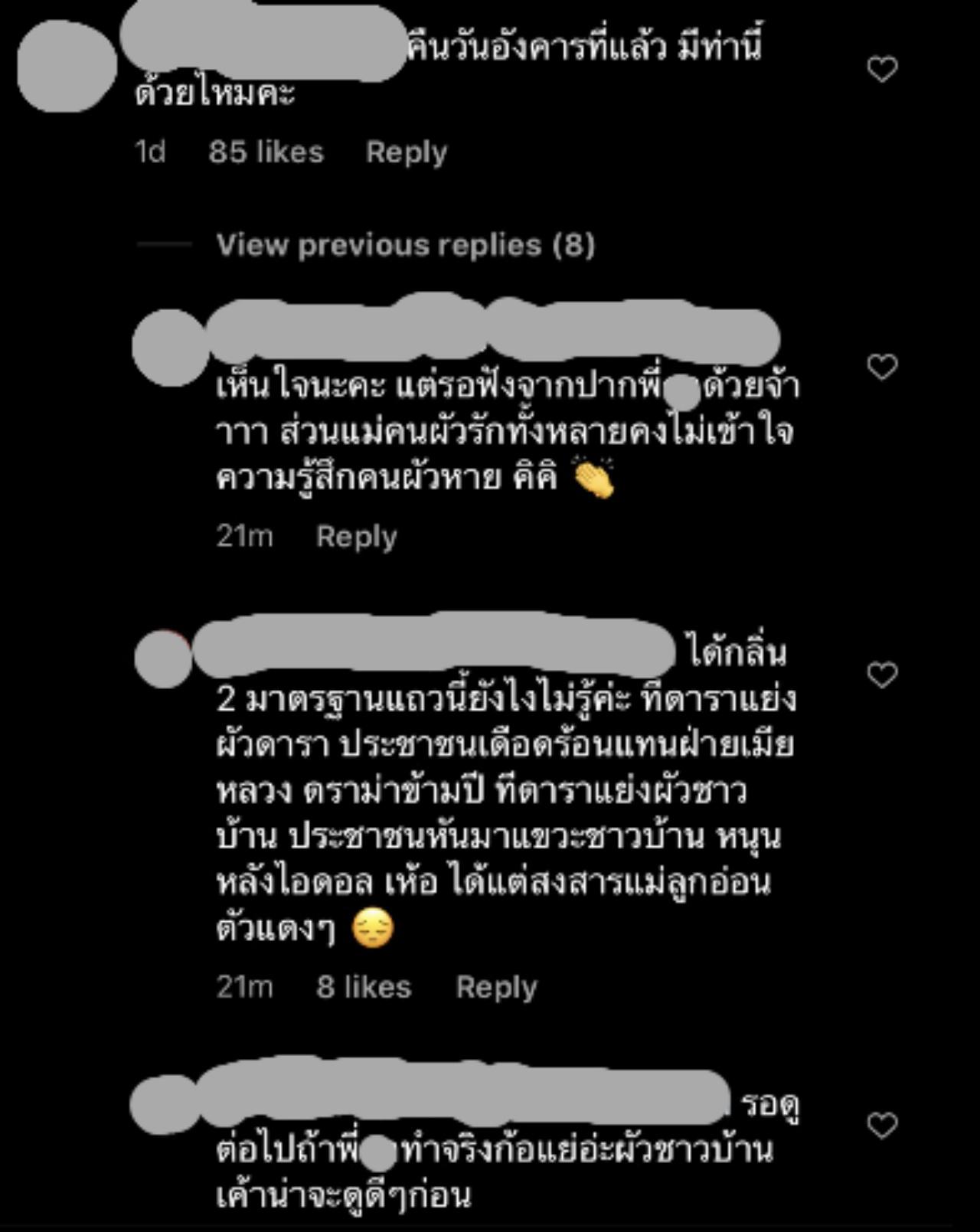 เห็นแบบนี้แฟนๆ ที่ติดตามนักร้องสาวคนดังกล่าวก็ได้เข้ามาแสดงความคิดเห็นกันมากมายทั้ง "เห็นใจนะคะ แต่รอฟังจากปากพี่...ด้วย ส่วนแม่คนผัวรักทั้งหลายคงไม่เข้าใจความรู้สึกคนผัวหาย", "ได้กลิ่น 2 มาตราฐาน ทีดาราแย่งผัวดาราประชาชนเดือดร้อนแทนฝ่ายเมียหลวงดราม่าข้ามปี ทีดาราแย่งผัวชาวบ้านประชาชนหันมาแขวะชาวบ้าน หนุนหลังไอดอล เห้อได้แต่สงสารแม่ลูกอ่อน" รอดูจอไปถ้าพี่...ทำจริงก็แย่"