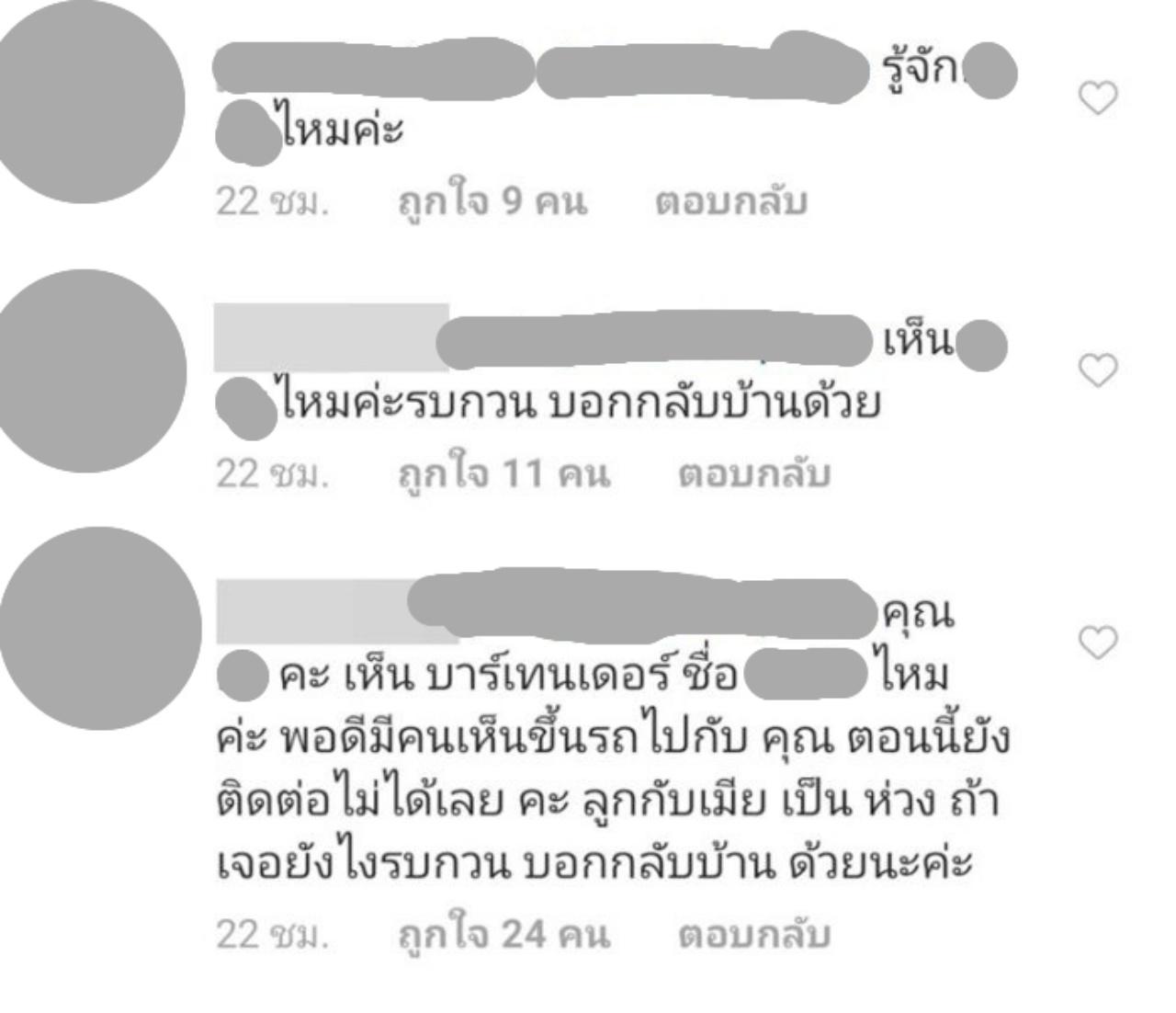 โดยผู้หญิงคนดังกล่าวเข้ามาคอมเม้นท์ว่า "เห็น...ไหมค่ะ รบกวนบอกกลับบ้านด้วย คุณ...คะเห็นบาร์เทนเดอร์ชื่อ...ไหมค่ะ พอดีมีคนเห็นขึ้นรถไปกับคุณ ตอนนี้ยังติดไม่ได้เลยคะ ลูกกับเมียเป็นห่วงถ้าเจอยังไงรบกวน บอกกลับบ้านด้วยนะคะ" และก็มีคอนเมนท์จากผู้หญิงคนเดิมว่า "คืนวันอังคารที่แล้วมีท่านี้ด้วยไหมคะ","อยากให้คุณ...มา....อีกจัง จะอุ้มลูกไปขอถ่ายรูป"