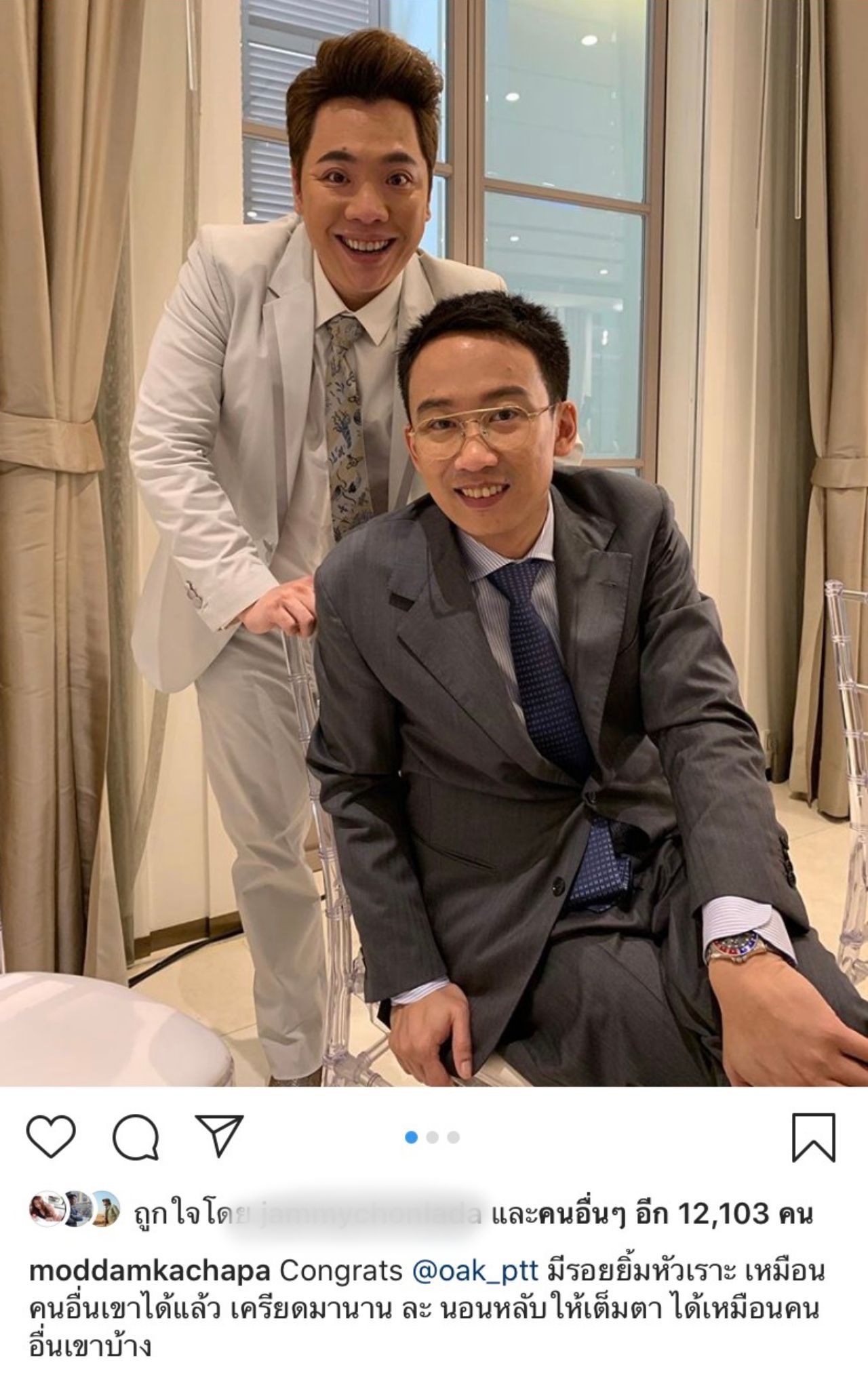 “Congrats @oak_ptt มีรอยยิ้ม หัวเราะ เหมือนคนอื่นเขาได้แล้ว เครียดมานานละ นอนหลับให้เต็มตา ได้เหมือนคนอื่นเขาบ้าง” หลังจากที่มดดำโพสต์ข้อความแสดงความยินดีกับเพื่อนรักไป ก็มีแฟนๆ เข้ามาคอมเมนต์ชื่นชมในความเป็นกัลยาณมิตรของมดดำและชื่นชมในความเป็นเพื่อนแท้ที่มีให้กับโอ๊คอย่างมากมาย