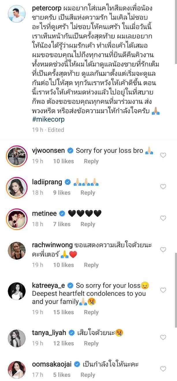 ผมขอขอบคุณไปถึงทุกงานที่ยินดีคืนคิวงานทั้งหมดช่วงนี้ให้ผมได้มาดูแลน้องชายที่รักเต็มที่เป็นครั้งสุดท้าย ดูแลกันมาตั้งแต่เริ่มจะดูแลกันต่อไปให้สุด ทุกวันเราหวังให้เค้าดีขึ้น ตอนนี้เราหวังให้เค้าหมดห่วงแล้วไปอยู่ในที่สบายก็พอ ต้องขอขอบคุณทุกคนที่มาร่วมงาน ส่งพวงหรีด หรือส่งข้อความมาให้กำลังใจครับ #mikecorp”