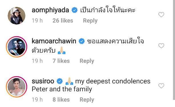 ซึ่งหลังจากที่ ปีเตอร์ โพสต์ไปก็มีแฟนๆ เข้ามาแสดงความเสียใจและให้กำลังใจเป็นจำนวนมาก รวมไปถึงคนบันเทิง อาทิ วุ้นเส้น วิริฒิพา, ปราง กัญญ์ณรัณ, ลูกเกด เมทินี, ก้อย รัชวิน, แคทรียา อิงลิช, ธัญญ่า ธัญญาเรศ, อ้อม พิยดา ฯลฯ.