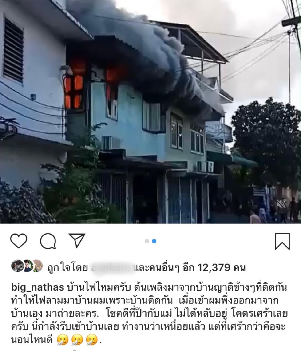 หลังจากนั้นไม่นาน เจ้าตัวก็ได้โพสต์รูปในขณะที่ไฟกำลังไหม้บ้าน พร้อมแคปชั่นว่า “บ้านไฟไหม้ครับ ต้นเพลิงมาจากบ้านญาติข้างๆ ที่ติดกัน ทำให้ไฟลามมาบ้านผมเพราะบ้านติดกัน เมื่อเช้าผมเพิ่งออกมาจากบ้านเอง มาถ่ายละคร โชคดีที่ป๊ากับแม่ไม่ได้หลับอยู่ โคตรเศร้าเลยครับ นี่กำลังรีบเข้าบ้านเลย ทำงานว่าเหนื่อยแล้ว แต่ที่เศร้ากว่าคือ จะนอนไหนดี”