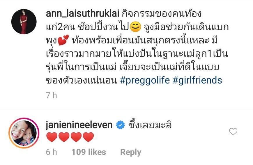 ซึ่ง เจนี่ ก็ได้เข้ามาคอมเมนต์ตอบเพื่อนซี้ว่า “ซึ้งเลยมะลิ” และใส่อีโมจิรูปหัวใจ นอกจากนี้ยังมีแฟนๆ เข้ามาคอมเมนต์ชมความสวยของคุณแม่ทั้งสอง บ้างก็บอกว่าแม่ๆ น่ารักมาก หน้าเด็กหน้าใสกันทั้งคู่ บางคนก็ถามว่าจะคลอดเมื่อไหร่ รอติดตามอยู่ ฯลฯ.