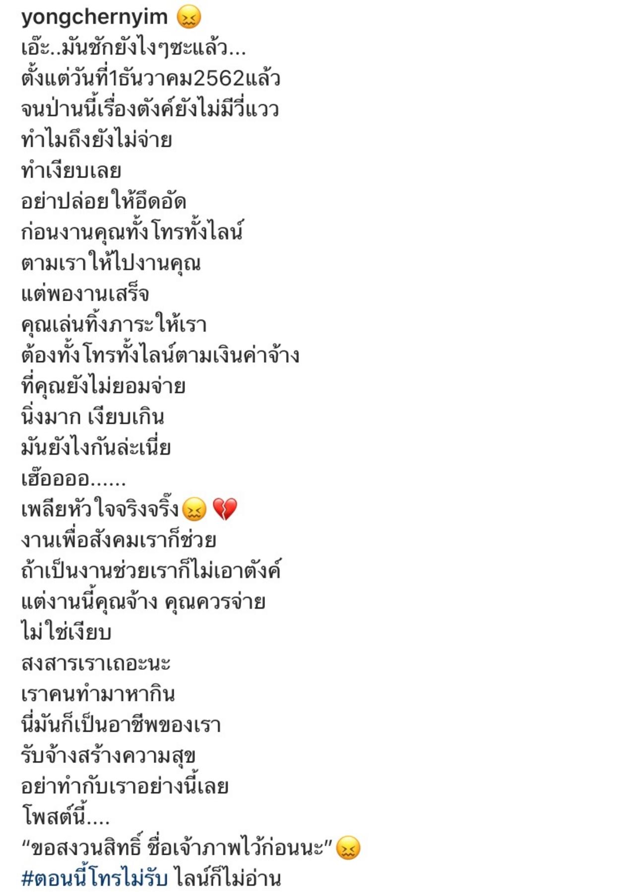 “เอ๊ะ..มันชักยังไงๆ ซะแล้ว...ตั้งแต่วันที่1ธันวาคม2562แล้ว จนป่านนี้เรื่องตังค์ยังไม่มีวี่แวว ทำไมถึงยังไม่จ่าย ทำเงียบเลย อย่าปล่อยให้อึดอัด ก่อนงานคุณทั้งโทรทั้งไลน์ ตามเราให้ไปงานคุณ แต่พองานเสร็จ คุณเล่นทิ้งภาระให้เรา ต้องทั้งโทรทั้งไลน์ตามเงินค่าจ้าง ที่คุณยังไม่ยอมจ่าย นิ่งมาก เงียบเกิน มันยังไงกันล่ะเนี่ย เฮ้ออออ......