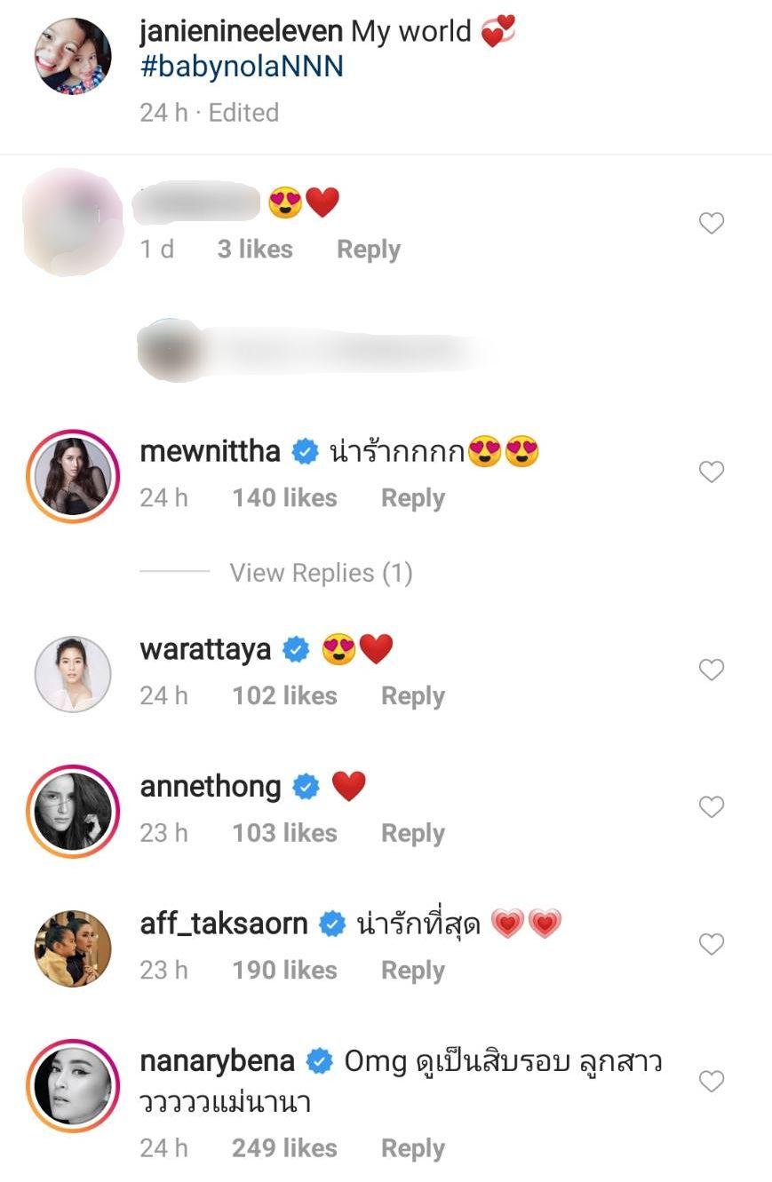 ล่าสุด เจนี่ โพสต์คลิปน่ารักๆ ของ น้องโนล่า ที่กำลังหลับตาพริ้มฟังเสียงเพลงคลอเบาๆ และเขียนแคปชั่น “My world #babynolaNNN” โดยมีแฟนๆ เข้ามาคอมเมนต์ชมความน่ารักเป็นจำนวนมาก รวมไปถึงคนบันเทิง อาทิ แอฟ ทักษอร, เบลล่า ราณี, มิว นิษฐา, จุ๋ย วรัทยา, แอน ทองประสม, เจ เจตริน ฯลฯ เข้ามาคอมเมนต์ชมความน่ารัก แต่ที่ดูจะหลงหลานหนักมากเห็นจะเป็น นานา ไรบีนา เพื่อนซี้ เจนี่ ที่บอกว่า “Omg ดูเป็นสิบรอบ ลูกสาววววววแม่นานา”