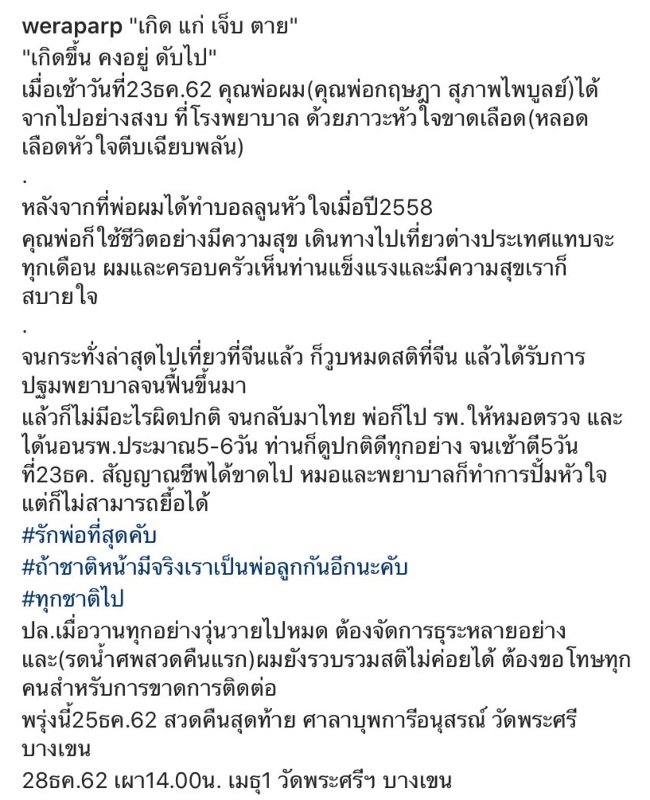 "เกิด แก่ เจ็บ ตาย เกิดขึ้น คงอยู่ ดับไป เมื่อเช้าวันที่ 23 ธ.ค.62 คุณพ่อผม(คุณพ่อกฤษฎา สุภาพไพบูลย์)ได้จากไปอย่างสงบ ที่โรงพยาบาล ด้วยภาวะหัวใจขาดเลือด(หลอดเลือดหัวใจตีบเฉียบพลัน)
