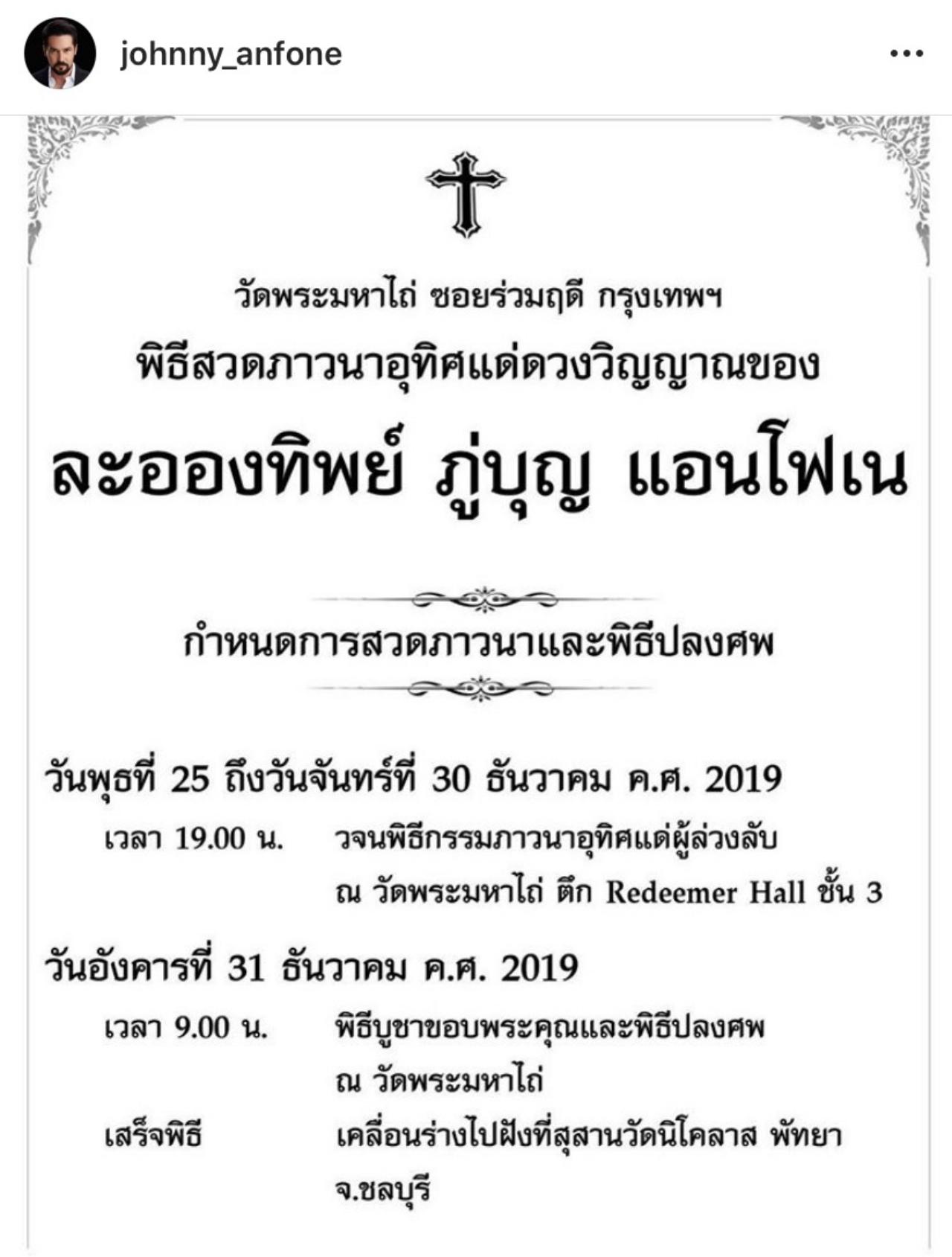โดยเจ้าตัวได้โพสต์ภาพกำหนดพิธีศพของคุณแม่ละอองทิพย์ ลงในอินสตาแกรมส่วนตัว โดยจะมีพิธีสวดภาวนาอุทิศแด่ผู้ที่ล่วงลับ ในวันที่ 25-30 ธันวาคมนี้ ณ วัดพระมหาไถ่ และมีพิธีปลงศพในวันที่ 31 ธันวาคม 2562 เวลา 09.00 น. ก่อนเคลื่อนร่างไปฝังที่สุสานที่ จ.ชลบุรี