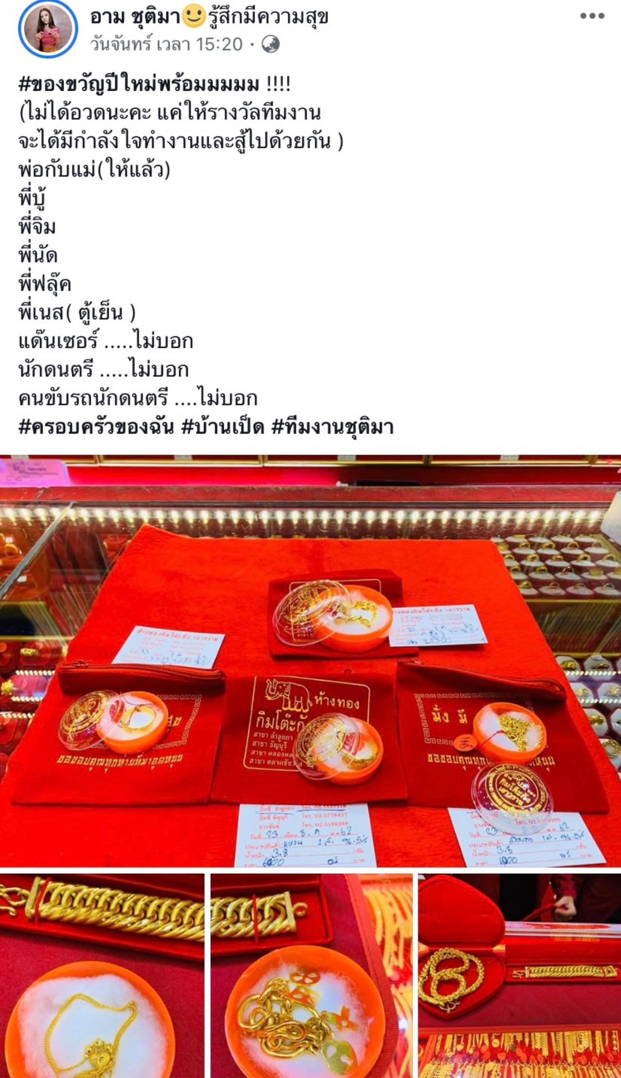 และล่าสุด นักร้องสาวก็ได้โพสต์รูปทองรูปพรรณลงในเฟซบุ๊กส่วนตัวของตัวเอง พร้อมกับแคปชั่นดักคอชาวเน็ตที่จะมาดราม่าว่า “#ของขวัญปีใหม่พร้อมมม !!! (ไม่ได้อวดนะคะ แค่ให้รางวัลทีมงานจะได้มีกำลังใจทำงานและสู้ไปด้วยกัน) #คอรบครัวของฉัน #บ้านเป็ด #ทีมงานชุติมา”