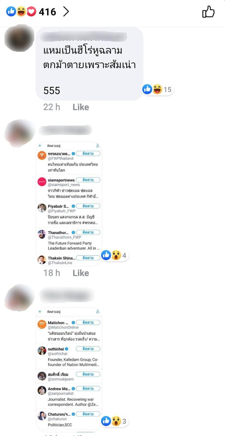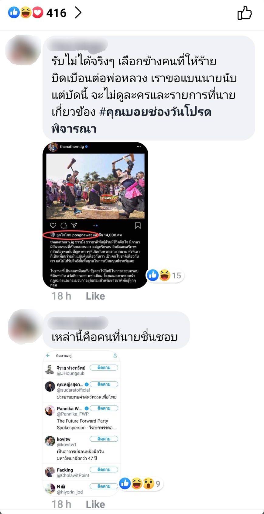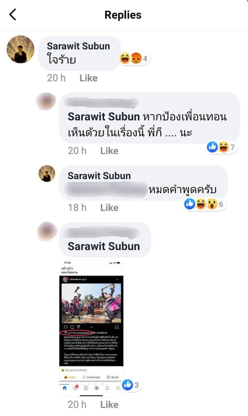 และในโพสต์ดังกล่าวมีนักแสดงหนุ่ม หมอก้อง สรวิชญ์ สุบุญ เข้ามาแสดงความคิดเห็นว่า “ใจร้าย” และมีคนคอมเมนต์ตอบกลับด้วยการโพสต์ภาพจากไอจีของ ธนาธร ที่ ป้อง กดไลค์ และ หมอก้อง ได้ตอบกลับว่า “หมดคำพูดครับ” ทำให้หลายคนมองว่า หมอก้อง รู้สึกไม่สบายใจเกี่ยวกับเรื่องนี้ นอกจากนี้ยังมีคนแสดงความคิดเห็นว่าเป็นฮีโร่หูฉลาม ตกม้าตายเพราะส้มเน่า ฯลฯ