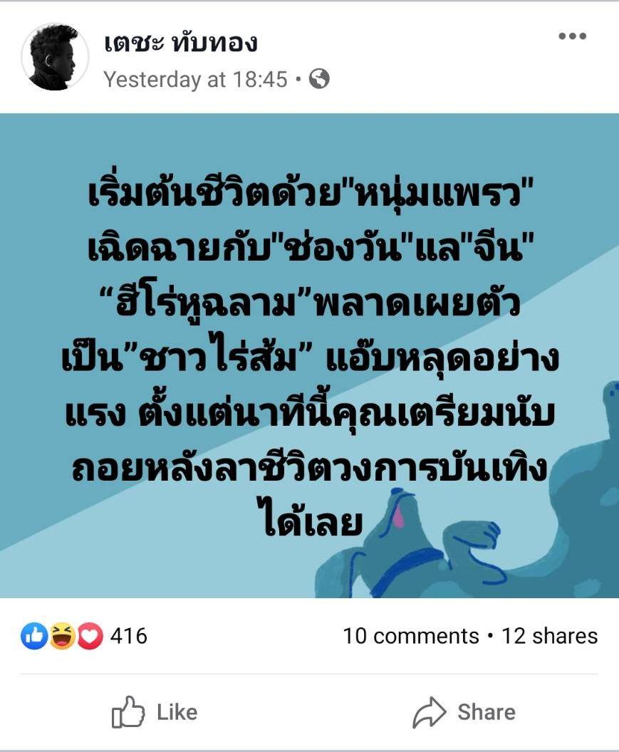 โดยในเฟซบุ๊ก เตชะ ทับทอง ได้โพสต์ข้อความว่า “เริ่มต้นชีวิตด้วย"หนุ่มแพรว" เฉิดฉายกับ"ช่องวัน"แล"จีน" “ฮีโร่หูฉลาม”พลาดเผยตัวเป็น”ชาวไร่ส้ม” แอ๊บหลุดอย่างแรง ตั้งแต่นาทีนี้คุณเตรียมนับถอยหลังลาชีวิตวงการบันเทิงได้เลย” และมีคนเข้ามาคอมเมนต์ทำนองว่ารับไม่ได้และขอแบน พร้อมทั้งโพสต์ภาพจากไอจีของ ธนาธร ซึ่ง ป้อง กดไลค์ภาพดังกล่าว และภาพที่อ้างว่าเป็นไอจีที่ ป้อง กดติดตามในทวิตเตอร์ ซึ่งส่วนมากเป็นบุคคลในพรรคการเมืองฝ่ายตรงข้ามรัฐบาล รวมไปถึงนักข่าวและอาจารย์ชื่อดัง