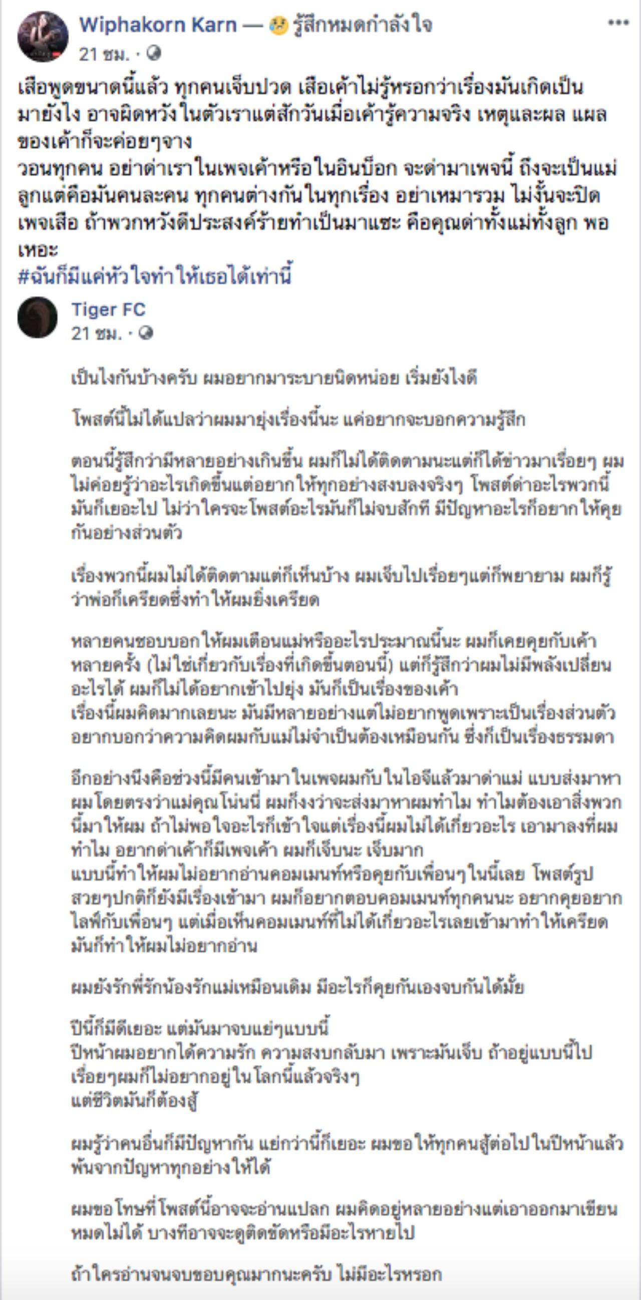 "เสือพูดขนาดนี้แล้ว ทุกคนเจ็บปวด เสือเค้าไม่รู้หรอกว่าเรื่องมันเกิดเป็นมายังไง อาจผิดหวังในตัวเราแต่สักวันเมื่อเค้ารู้ความจริง เหตุและผล แผลของเค้าก็จะค่อยๆ จาง