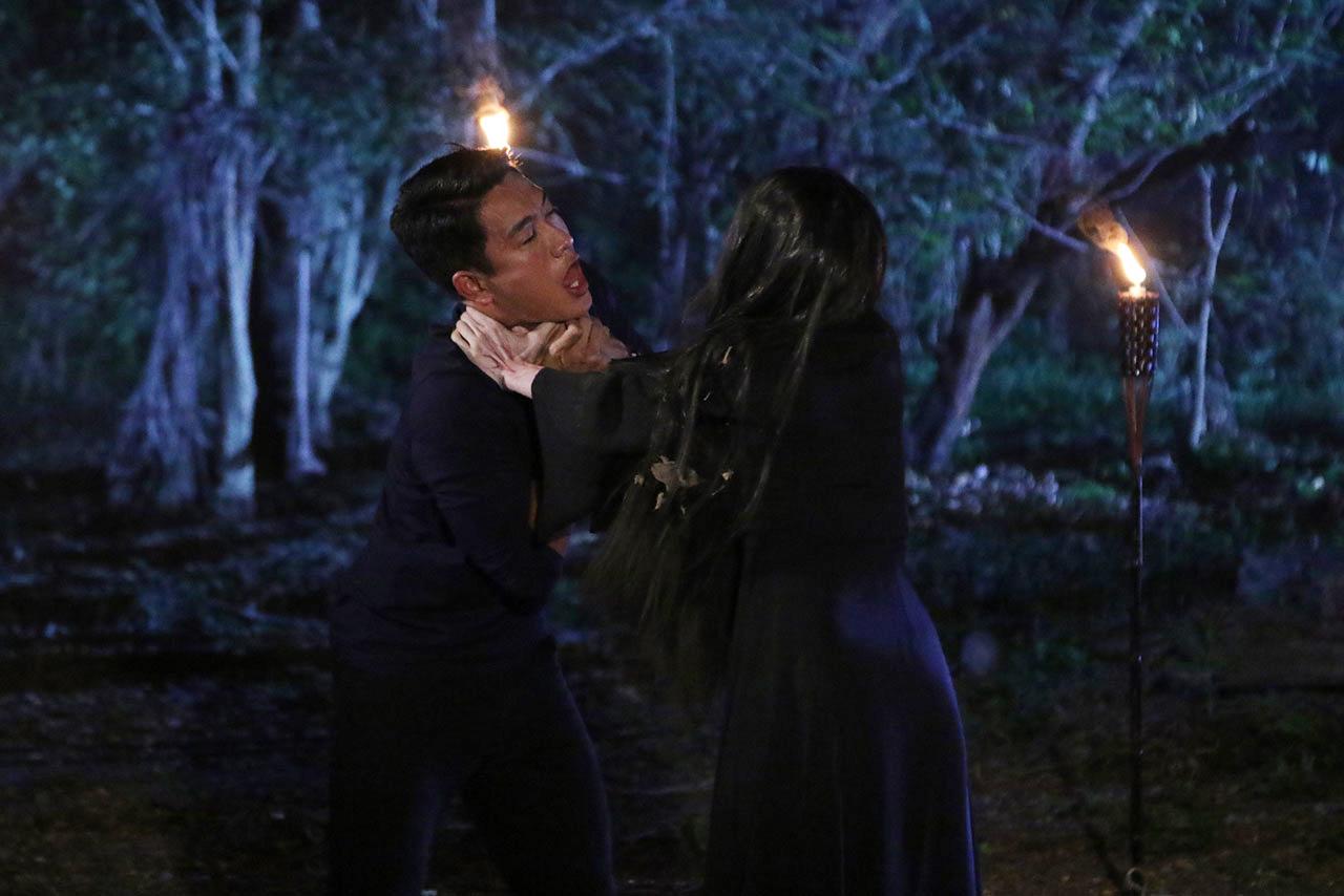 และด้วยชุดผีที่ทั้งยาวกรุยกราย แถมต้องใส่วิกยาวเกือบลากพื้น ช่วงซ้อม น้ำหวานต้องโดนสร้อยพระแล้วกระเด็นลงไปนอนกับพื้น งานนี้ทำเอา กอล์ฟ จั๊กจั่นขำก๊าก เพราะใบไม้ติดหัวน้ำหวาน จากความน่ากลัวกลายเป็นความฮาซะงั้น เมื่อซักซ้อมคิวจนเป๊ะถ่ายจริงเริ่มที่ จั๊กจั่น โดนสะกดจิตโดยผีน้ำหวานล่อมากลางป่า กะหวังฆ่าให้เป็นตัวตายตัวแทน กอล์ฟตามมาติดๆ รีบเอาสร้อยพระใส่ให้จั๊กจั่น น้ำหวานมองตาขวาง จั๊กจั่นได้สติวิ่งโผเข้ามากอดกอล์ฟ กอล์ฟดราม่าน้ำตานองขออโหสิกรรมและบอกว่าไม่เคยรักน้ำหวานเลย น้ำหวานฟัง กรี๊ดระเบิดอารมณ์ น้ำตาไหล วิ่งมาบีบคอกอล์ฟ จั๊กจั่นพยายามช่วยแต่โดนผลักกระเด็น ร้องไห้ขอร้องให้น้ำหวานหยุด น้ำหวานผลักกอล์ฟกระแทกกับต้นไม้ แล้วลงไปบีบคอซ้ำกะเอาตาย