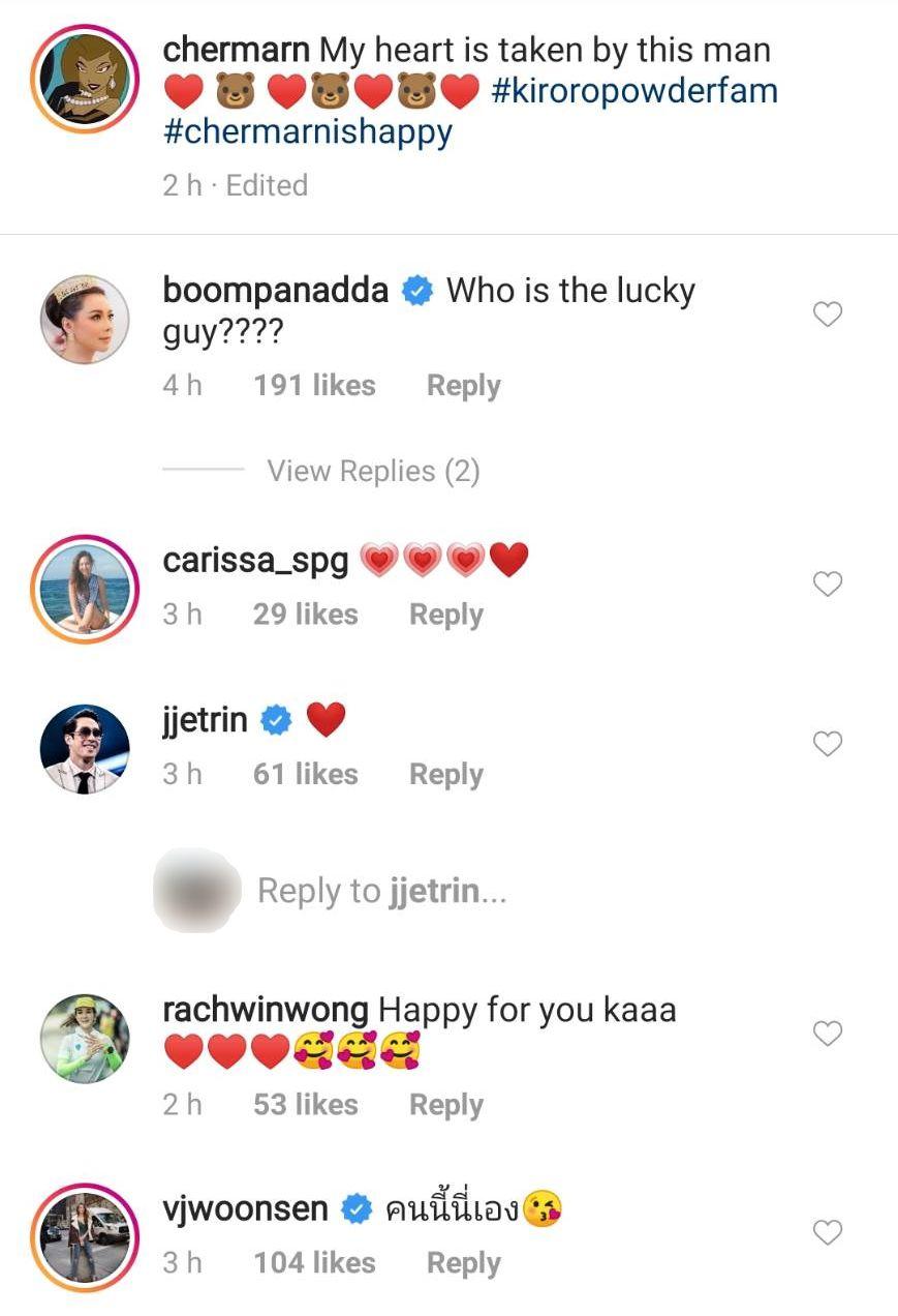 โดยมีแฟนๆ เข้ามาคอมเมนต์แสดงความยินดีเป็นจำนวนมาก รวมไปถึงคนในวงการบันเทิงอีกหลายคน แต่ที่หลายคนถูกอกถูกใจเห็นจะเป็นคอมเมนต์จากพิธีกร-นักแสดงรุ่นพี่ บุ๋ม ปนัดดา วงศ์ผู้ดี ที่ถามตรงๆ ว่า “Who is the lucky guy????” เรียกว่าถามตรงใจแฟนๆ หลายคนเลยจริงๆ