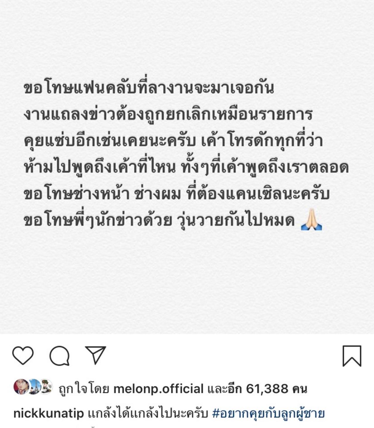 ผู้สื่อข่าวสอบถามต่อถึงสาเหตุของการแคนเซิลคิวรายการ ผู้จัดการของแตงโมก็เผยต่อว่า “ได้รับสารจากแตงโมมาอีกทีนึงว่า ไม่ได้ไปออกรายการแล้ว เพราะพี่พชร์โทรไปคุยกับทางแกรมมี่มา ไม่รู้ว่าคุยเรื่องอะไร และไม่รู้ว่าที่ไม่ไปเพราะเรื่องอยู่ในขั้นตอนศาล หรือเพราะเกรงใจอีกฝ่าย ไม่ไปเพราะเหตุนี้ ไม่ใช่ไม่ไปเพราะว่าท้อง” เคลียร์ชัดเจนแบบนี้แล้ว ตัดชื่อของสาวแตงโมออกจากข่าวลือนี้ได้เลย