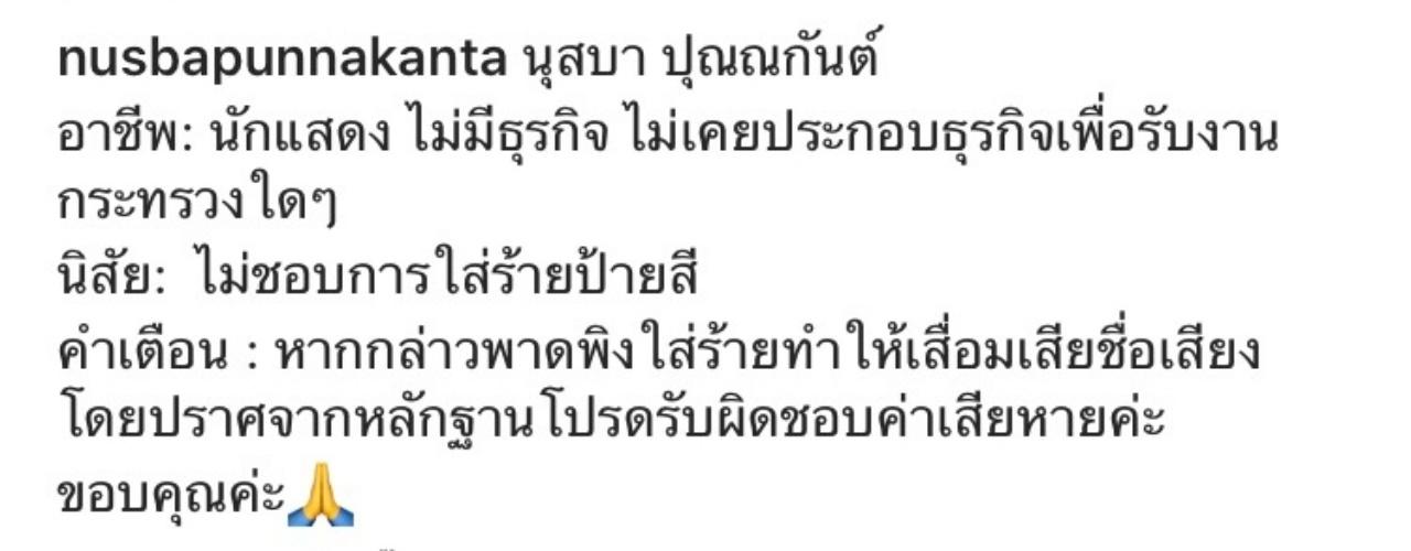 จนทำให้ นุสบา ต้องออกโรงโพสต์ข้อความผ่านอินสตาแกรมเชือดนิ่มๆ โดยบอกว่า อาชีพหลักของเธอคือนักแสดง ไม่มีธุรกิจเพื่อรับงานกระทรวงใดๆ ทั้งสิ้น หากมีการใส่ร้ายป้ายสี โดยไม่มีหลักฐาน โปรดรับผิดชอบค่าเสียหายด้วย