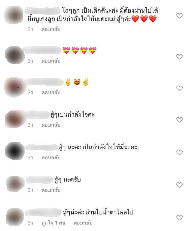 ซึ่งหลังจากนั้นก็มีแฟนๆ เข้ามาส่งกำลังใจให้เอ็มมี่และชื่นชมน้องจื้อหลิงเป็นจำนวนมาก บ้างก็บอกว่าเป็นเด็กดีนะคะ มี๊ต้องผ่านไปให้ได้ มี๊หนูเก่งลูก เป็นกำลังใจให้นะคะแม่ บ้างก็บอกว่าสู้ๆ อ่านไปน้ำตาไหลไป.
