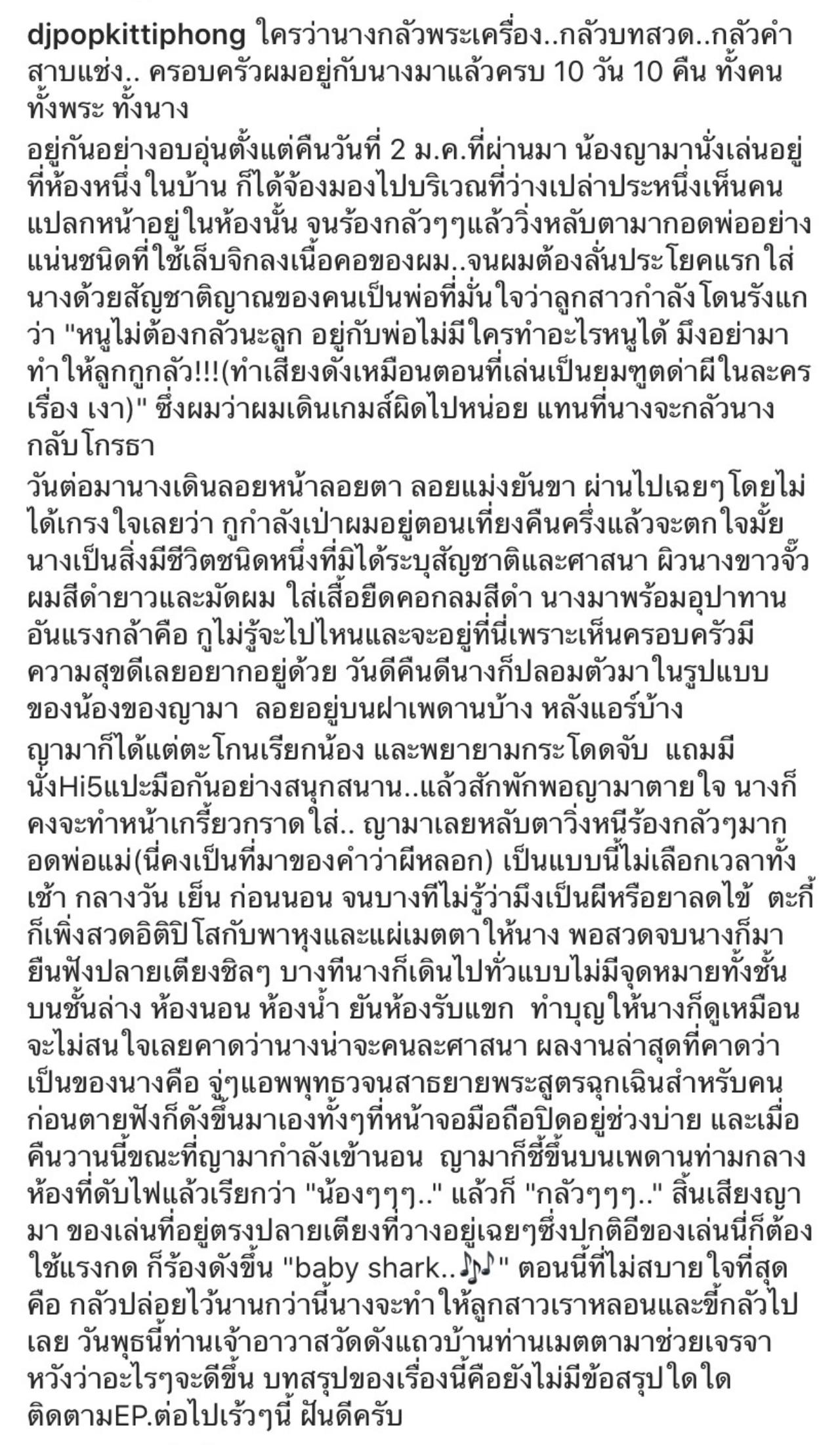 ดีเจป๊อป กิตติพงศ์ เล่าประสบการณ์ความหลอนที่ต้องพบเจอกับสิ่งลี้ลับที่มาอยู่ร่วมในบ้านและอยู่ด้วยกันมา 10 วันเต็มๆ แล้ว พร้อมกันนี้ สิ่งลี้ลับดังกล่าวยังหลอกลูกสาวของตนจนขวัญผวาไปหมดแล้ว ซึ่งดีเจป๊อปเล่าเรื่องนี้ผ่านทางอินสตาแกรมของตัวเองว่า