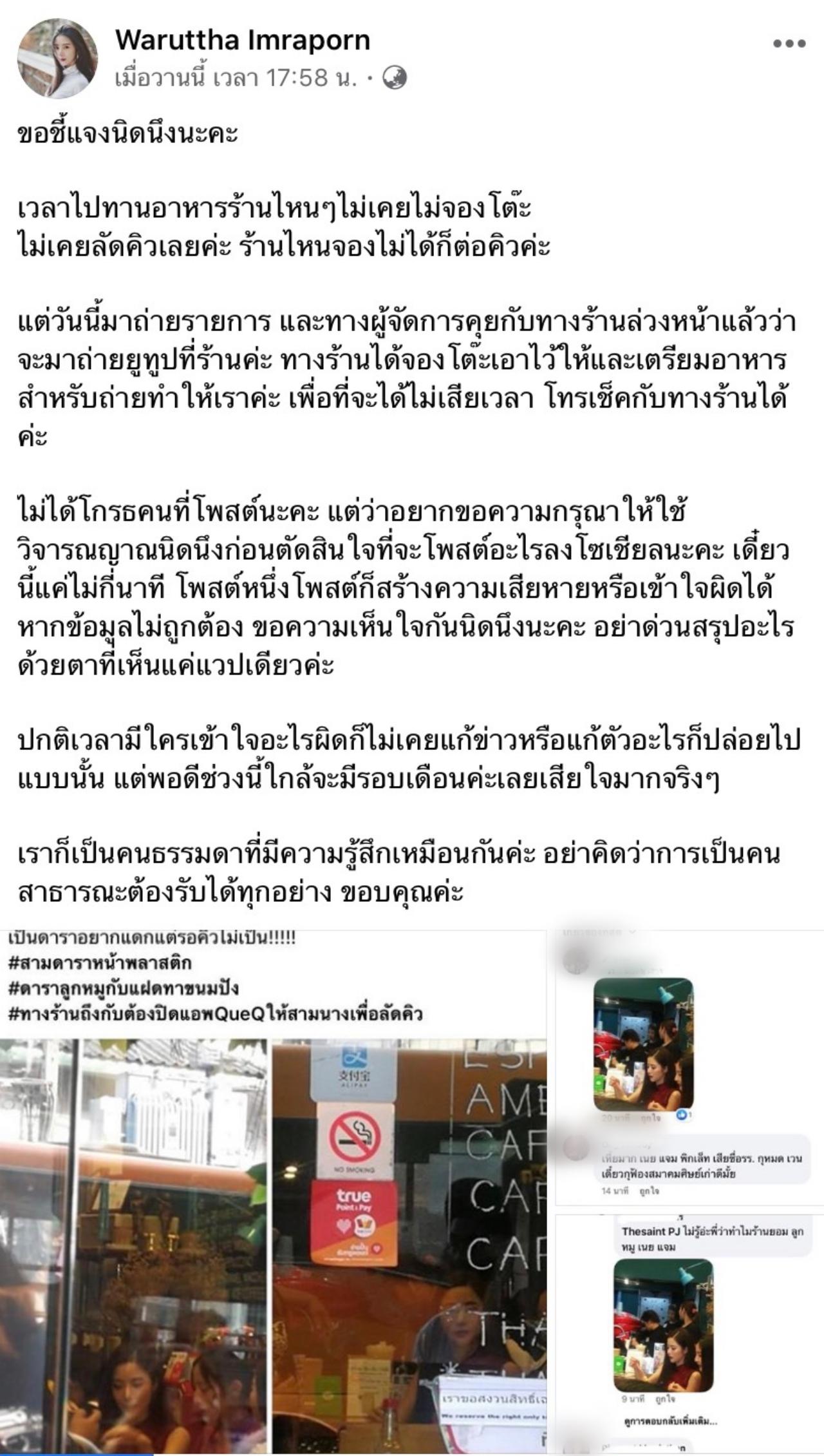 หลังจากที่คนในโซเชียลถกเถียงกันอยู่พักใหญ่ เนย วรัฐฐา จึงได้ออกมาเพื่อขอชี้แจงดราม่าการลัดคิวผ่านทางเฟซบุ๊กส่วนตัวของตัวเองว่า "ขอชี้แจงนิดนึงนะคะ เวลาไปทานอาหารร้านไหนๆ ไม่เคยไม่จองโต๊ะ ไม่เคยลัดคิวเลยค่ะ ร้านไหนจองไม่ได้ก็ต่อคิวค่ะ
