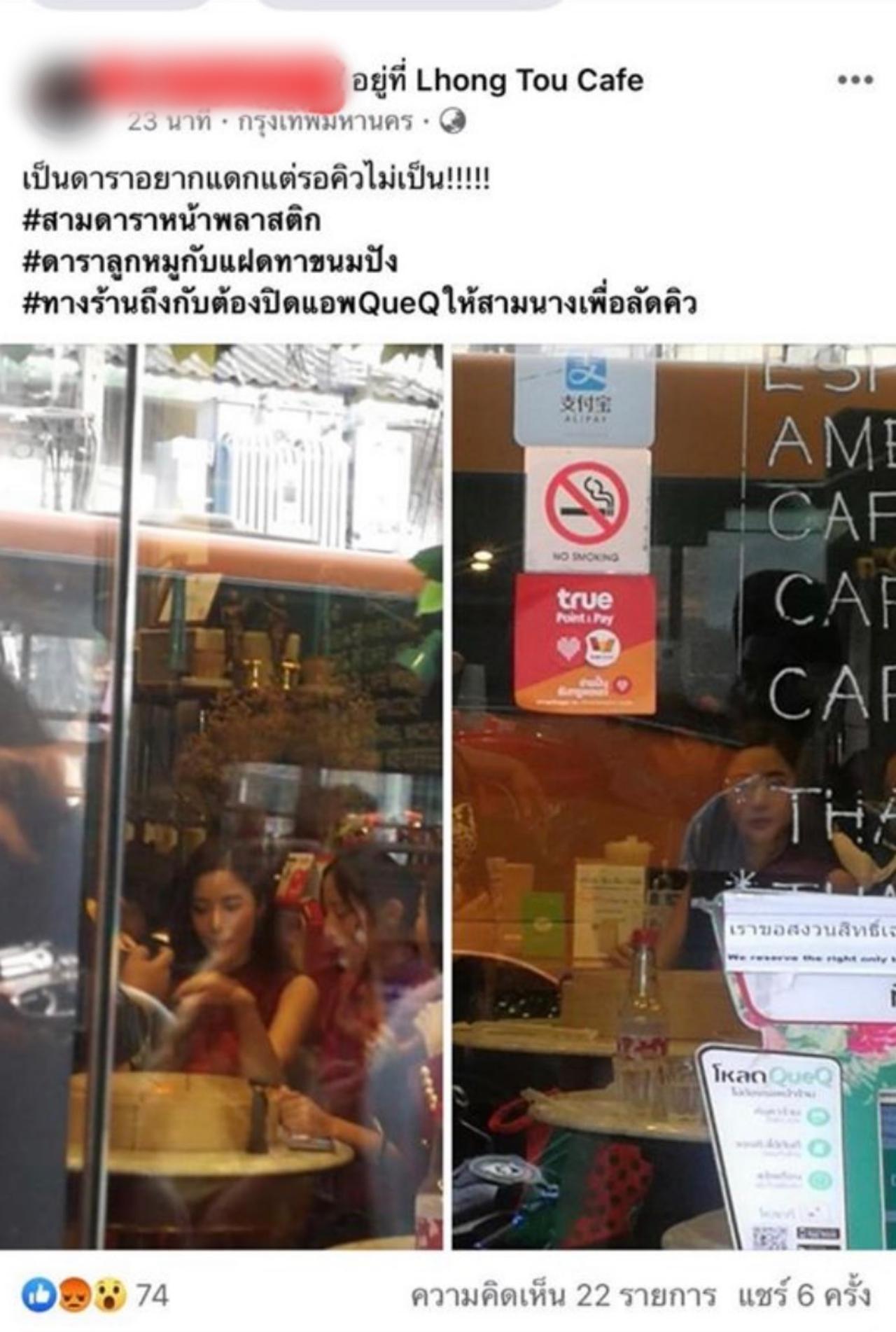 โซเชียลเดือด เมื่อมีคนออกมาเขียนแฉพฤติกรรมของคนในวงการบันเทิงว่า “เป็นดาราอยากแดกแต่รอคิวไม่เป็น!!!! #สามดาราหน้าพลาสติก #ดาราลูกหมูกับแฝดทาขนมปัง #ทางร้านถึงกับต้องปิดแอพQueQให้สามนางเพื่อลัดคิว” พร้อมกับโพสต์รูปของดาราทั้ง 3 คน หลังจากที่มีคนโพสต์ข้อความดังกล่าวไป ก็มีคนเข้ามาวิจารณ์ถึงพฤติกรรม และถามว่าดาราคนดังกล่าวคือใคร
