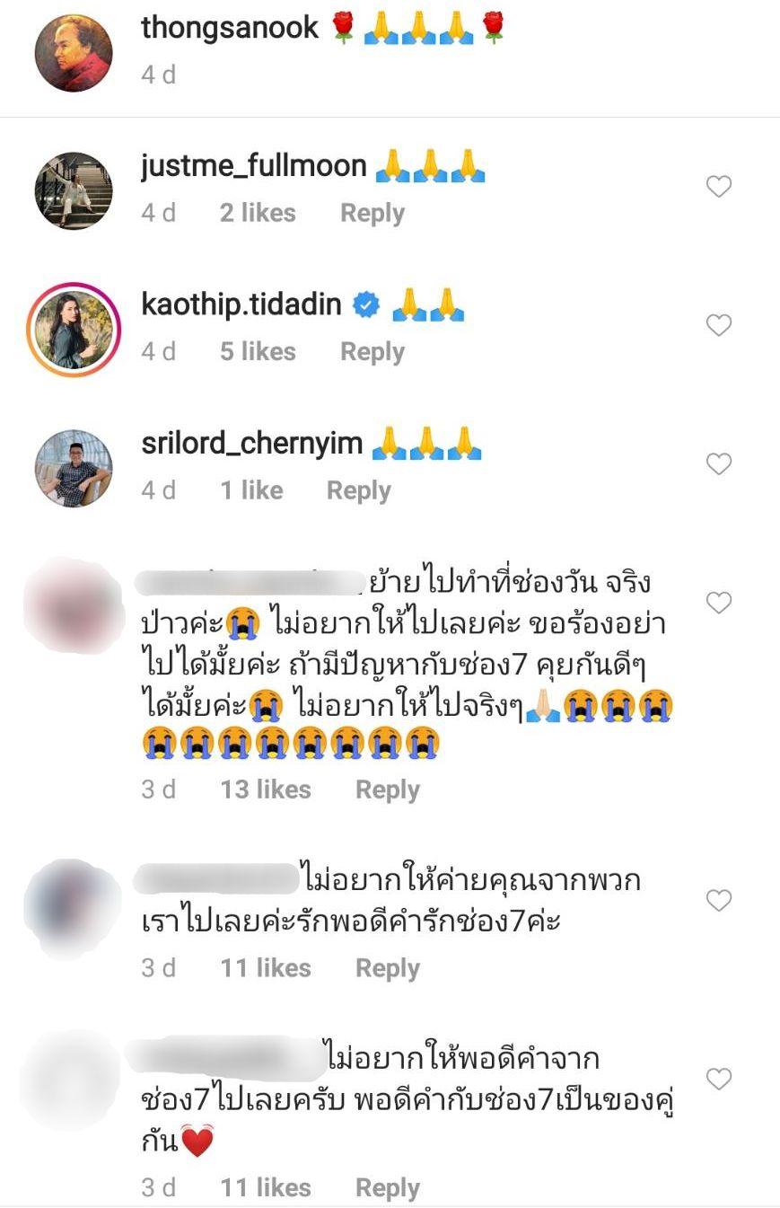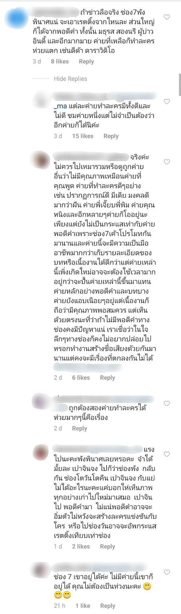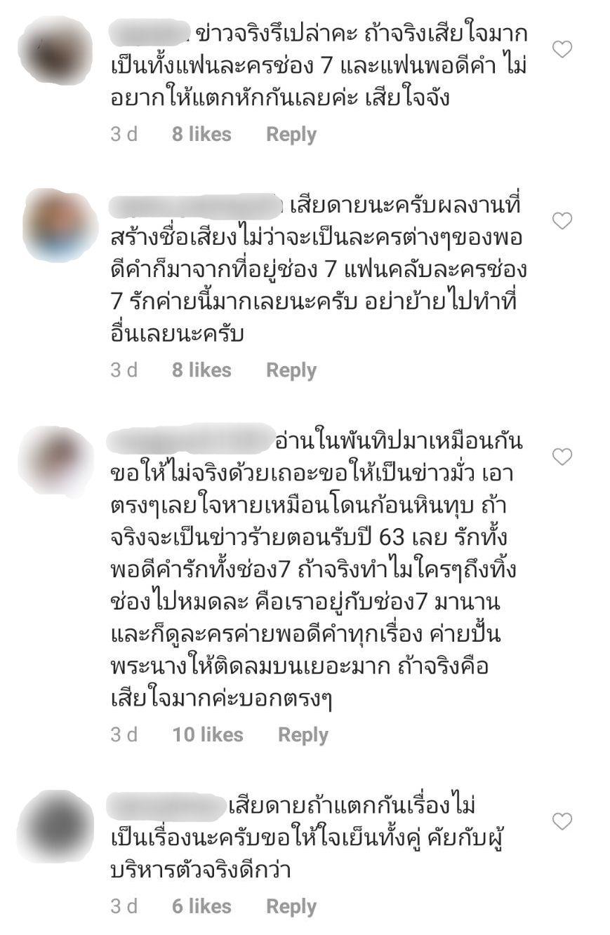 ซึ่งคำถามที่แฟนละครแห่คอมเมนต์กันเป็นจำนวนมาก เป็นคำถามที่ถามถึงข้อเท็จจริงที่ว่า ค่ายพอดีคำ จะย้ายออกจากช่อง 7 จริงหรือ โดยแฟนละครส่วนใหญ่บอกว่าเสียดาย เพราะเห็นว่าทางค่ายทำละครให้กับช่อง 7 มานาน พร้อมทั้งขอร้องว่าไม่อยากให้ไป หากมีปัญหาก็ขอให้คุยกันดีๆ แต่หลังจากนั้นก็กลายเป็นดราม่า เมื่อมีการพาดพิงไปถึงค่ายละครอื่นด้วย