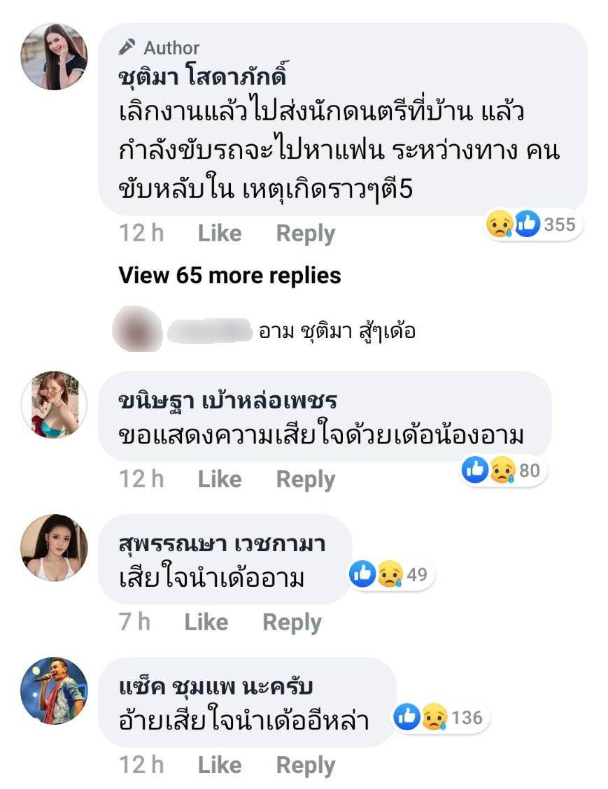 ซึ่งหลังจากที่แฟนเพลงได้ทราบข่าวร้ายดังกล่าว ต่างเข้ามาแสดงความเสียใจกับนักร้องสาวรวมไปถึงครอบครัวของคนขับรถตู้เป็นจำนวนมาก ด้านนักร้องลูกทุ่ง อาทิ เบล ขนิษฐา, ลำไย ไหทองคำ, แซ็ค ชุมแพ ฯลฯ ก็คอมเมนต์แสดงความเสียใจเช่นกัน บันเทิงไทยรัฐออนไลน์ขอแสดงความเสียใจด้วยนะคะ.