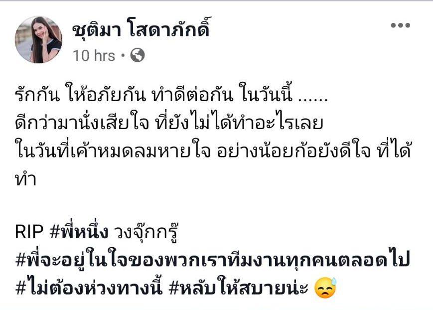 จากนั้น อาม ชุติมา โพสต์ภาพและข้อความสุดเศร้าอีกว่า “รักกัน ให้อภัยกัน ทำดีต่อกัน ในวันนี้ ...... ดีกว่ามานั่งเสียใจ ที่ยังไม่ได้ทำอะไรเลย ในวันที่เค้าหมดลมหายใจ อย่างน้อยก็ยังดีใจที่ได้ทำ RIP #พี่หนึ่ง วงจุ๊กกรู๊ #พี่จะอยู่ในใจของพวกเราทีมงานทุกคนตลอดไป #ไม่ต้องห่วงทางนี้ #หลับให้สบายน่ะ”