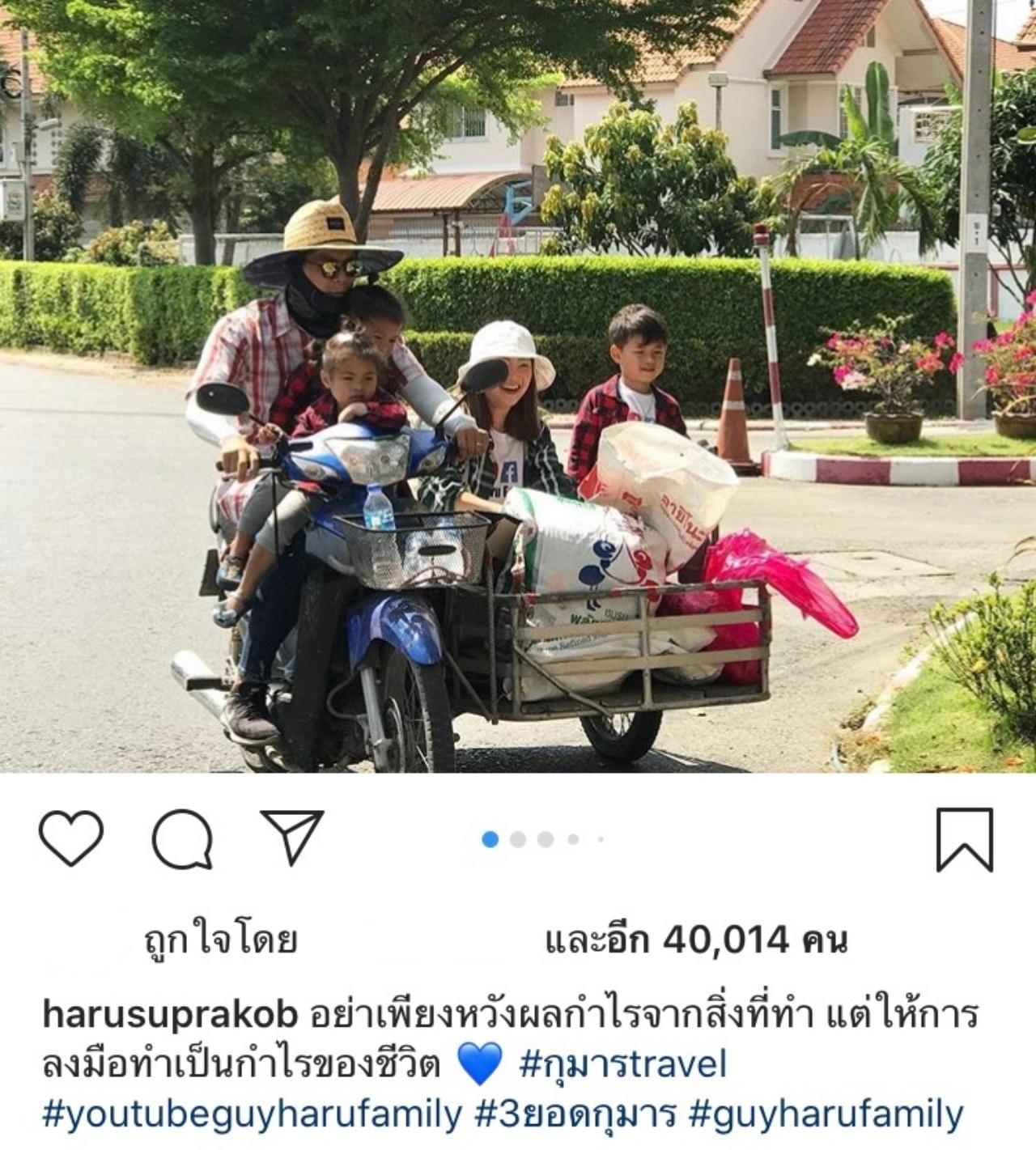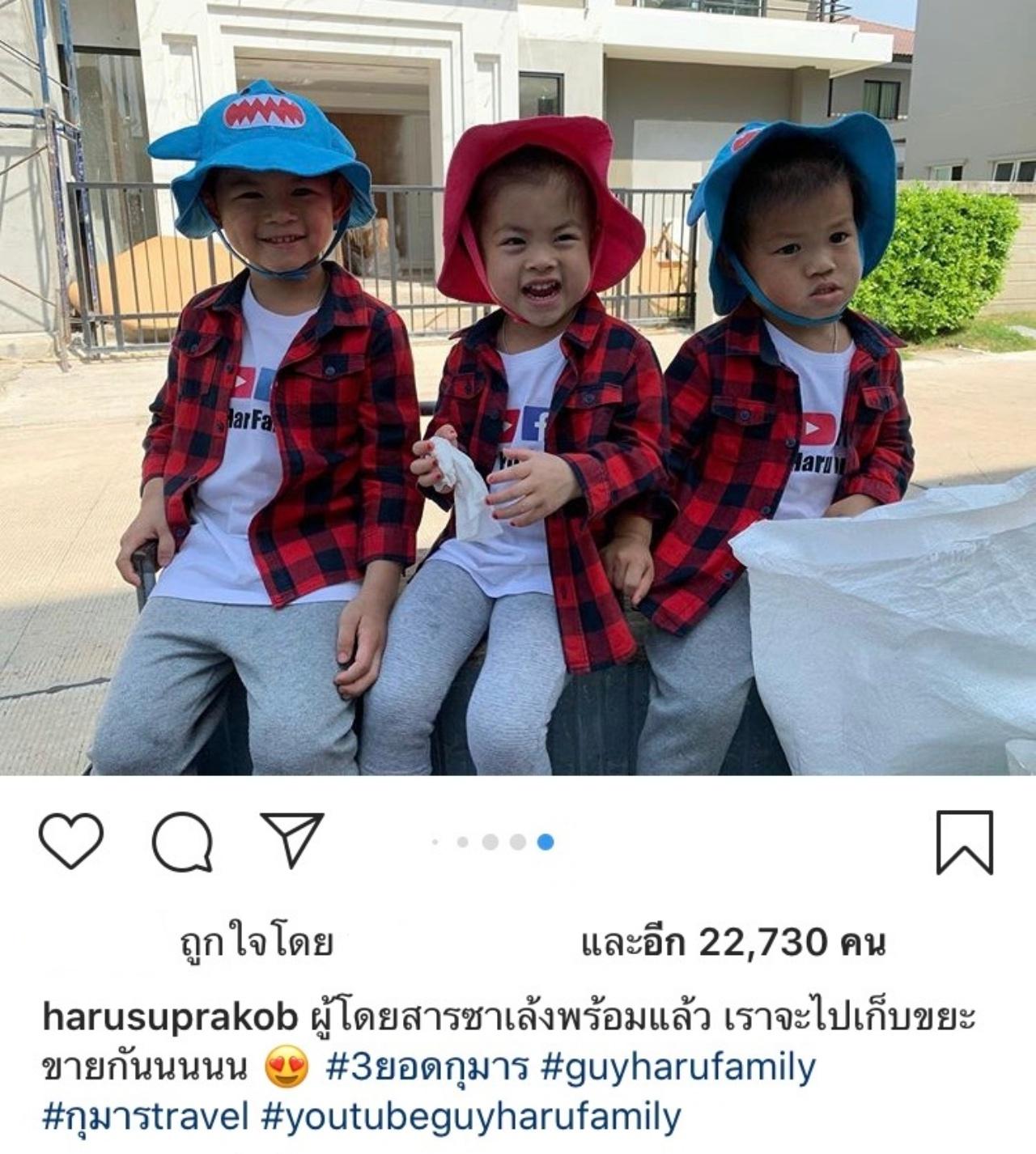 โดย ฮารุ ได้โพสต์ภาพ 3 ยอดกุมารที่นั่งอยู่บนรถซาเล้ง และถุงปุ๋ยเพื่อขับไปตามสถานที่ต่างๆ เก็บขวดน้ำเพื่อเอาไปขาย พร้อมกับเขียนแคปชั่นว่า "อย่าเพียงหวังผลกำไรจากสิ่งที่ทำ แต่ให้การลงมือทำเป็นกำไรของชีวิต"