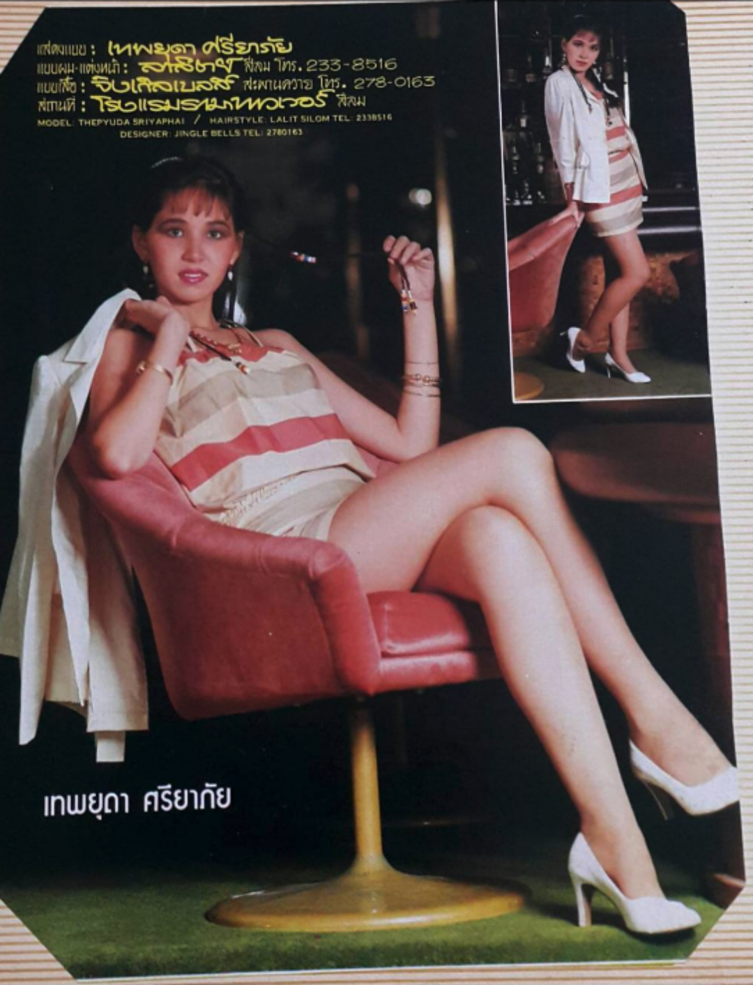 "พี่เคยเดินแบบให้กับแบรนด์ชาแนล (Chanel) เดินกับนายแบบอินเตอร์ เดิน 6 ชุด ภาพเก็บไว้แล้วนะ แต่ตอนนี้หาไม่เจอ ไม่รู้หายไปไหนแล้ว (หัวเราะ) เพราะมันเก่ามากนานหลายปีมากแล้ว และได้เดินแบบให้แบรนด์ อีฟส์ แซงต์ โลรองต์ (Yves Saint Laurent) แบรนด์นี้ดังมากๆ พี่เดินให้น่าจะ 10 ชุด เปลี่ยนชุดแก้ผ้ากันสนุกเลย (หัวเราะ) คือดีไซเนอร์ไทยท่านนี้ เคยไปเรียนออกแบบที่ฝรั่งเศส เลยมีคอนเนกชั่นไปเอาเสื้อผ้าของสองแบรนด์นี้ มาให้นางแบบไทยได้เดินแบบกัน จำได้ว่าเดินแบบที่โรงแรมดุสิตธานี