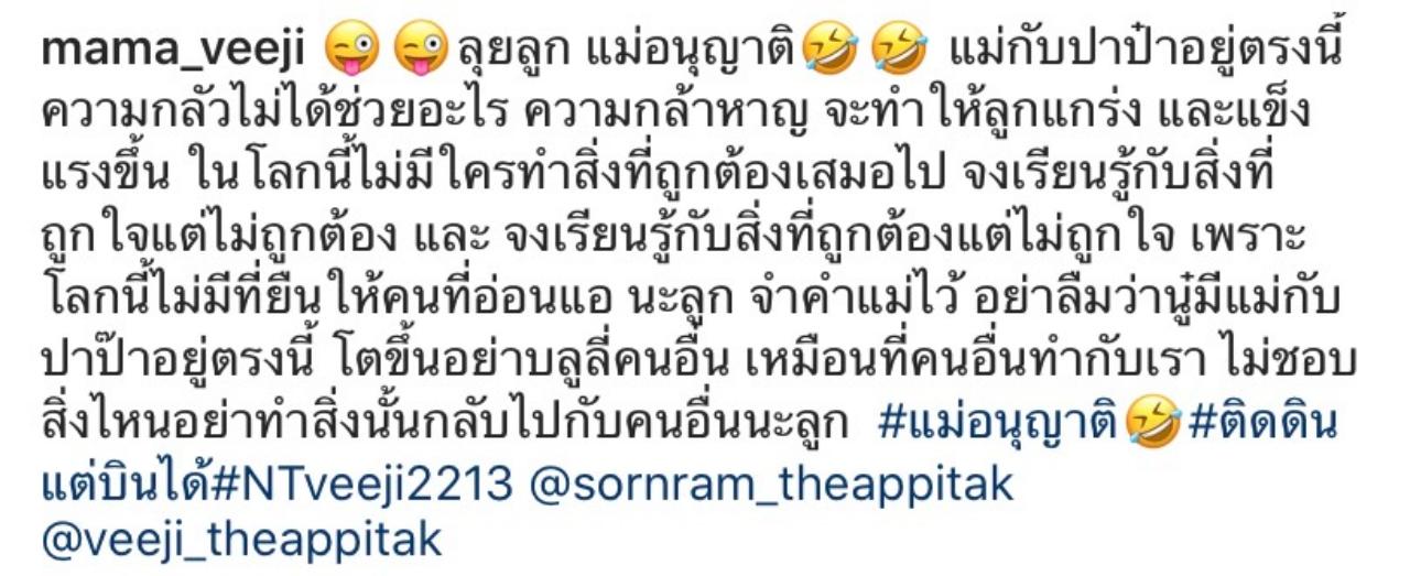“ลุยลูก แม่อนุญาต แม่กับปาป๋าอยู่ตรงนี้ความกลัวไม่ได้ช่วยอะไร ความกล้าหาญ จะทำให้ลูกแกร่ง และแข็งแรงขึ้น ในโลกนี้ไม่มีใครทำสิ่งที่ถูกต้องเสมอไป จงเรียนรู้กับสิ่งที่ถูกใจแต่ไม่ถูกต้อง และจงเรียนรู้กับสิ่งที่ถูกต้องแต่ไม่ถูกใจ