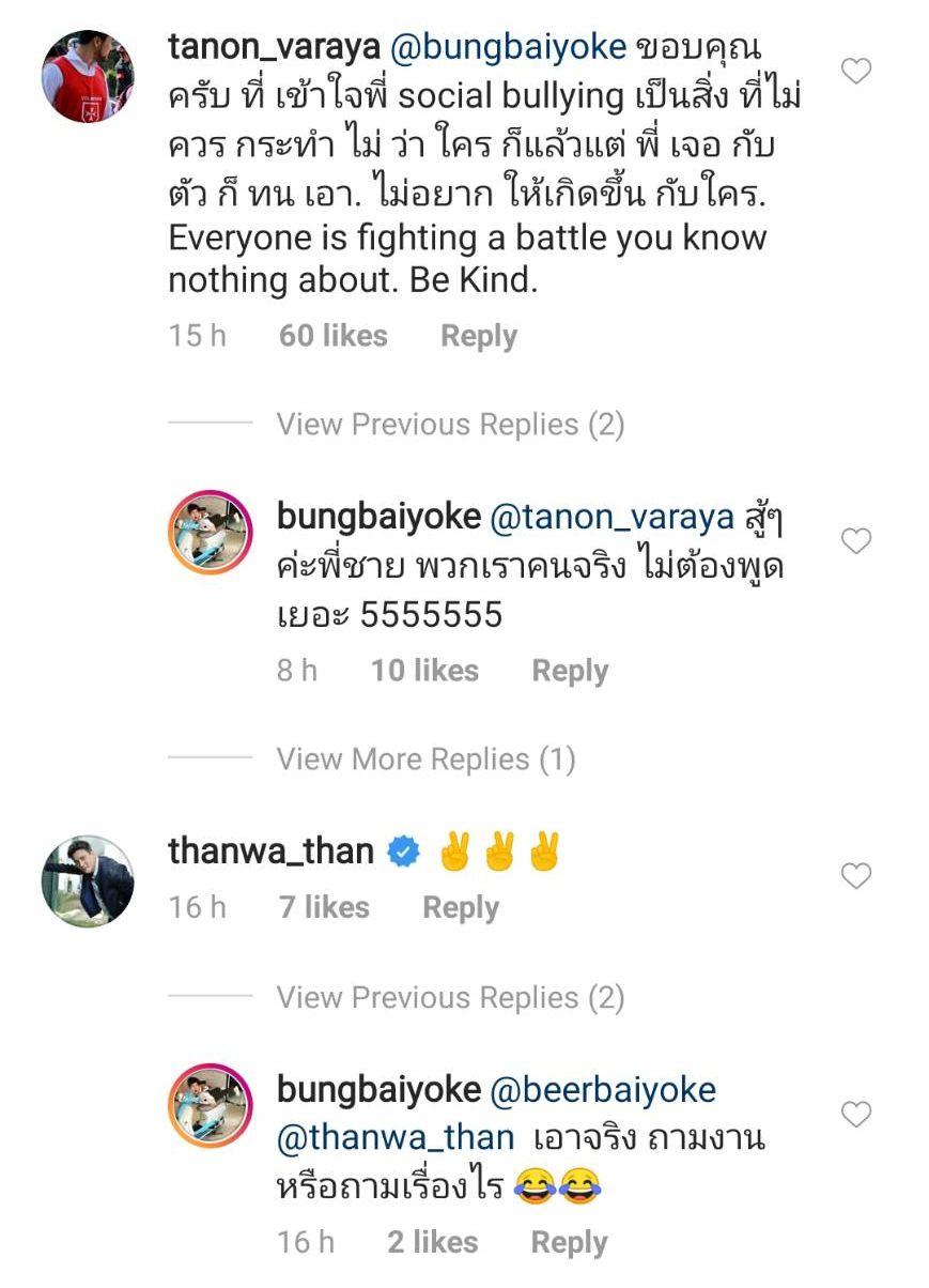ซึ่งหลังจากที่ บุ้ง ใบหยก โพสต์ภาพและข้อความดังกล่าวไป ก็มีชาวเน็ตแสดงความคิดเห็นกันหลายคน ด้าน ไฮโซนนท์ ก็ได้เข้ามาคอมเมนต์ขอบคุณ บุ้ง โดยมีข้อความว่า “ขอบคุณครับที่เข้าใจพี่ social bullying เป็นสิ่งที่ไม่ควรกระทำ ไม่ว่าใครก็แล้วแต่ พี่เจอกับตัวก็ทนเอา ไม่อยากให้เกิดขึ้นกับใคร Everyone is fighting a battle you know nothing about. Be Kind.” และ บุ้ง ตอบกลับว่า “สู้ๆ ค่ะพี่ชาย พวกเราคนจริง ไม่ต้องพูดเยอะ 5555555”.