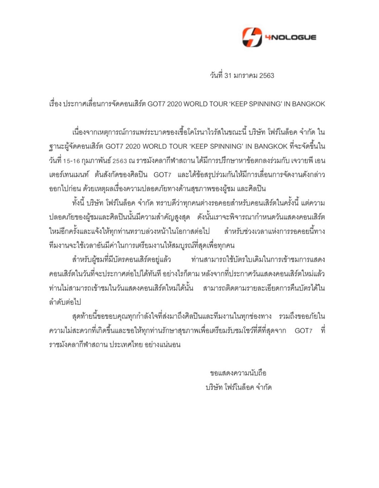 หลังจากที่เชื้อไวรัสโคโรน่าได้ระบาดอย่างหนัก และตอนนี้เชื้อได้เริ่มลุกลามเข้าประเทศไทยแล้ว จากรายงานข่าวได้แจ้งว่า ขณะนี้ประเทศไทยได้ตรวจพบผู้ติดเชื้อไวรัสโคโรน่าแล้วทั้งหมด 19 ราย งานนี้ทำให้ผู้จัดคอนเสิร์ต GOT7 2020 World Tour 'Keep Spinning' in bangkok ที่จะจัดขึ้นในวันที่ 15-16 กุมภาพันธ์ 2563 ที่ราชมังคลากีฬาสถาน ได้ประกาศเลื่อนงานคอนเสิร์ตออกไป เพื่อความปลอดภัยด้านสุขภาพผู้ชมและศิลปิน