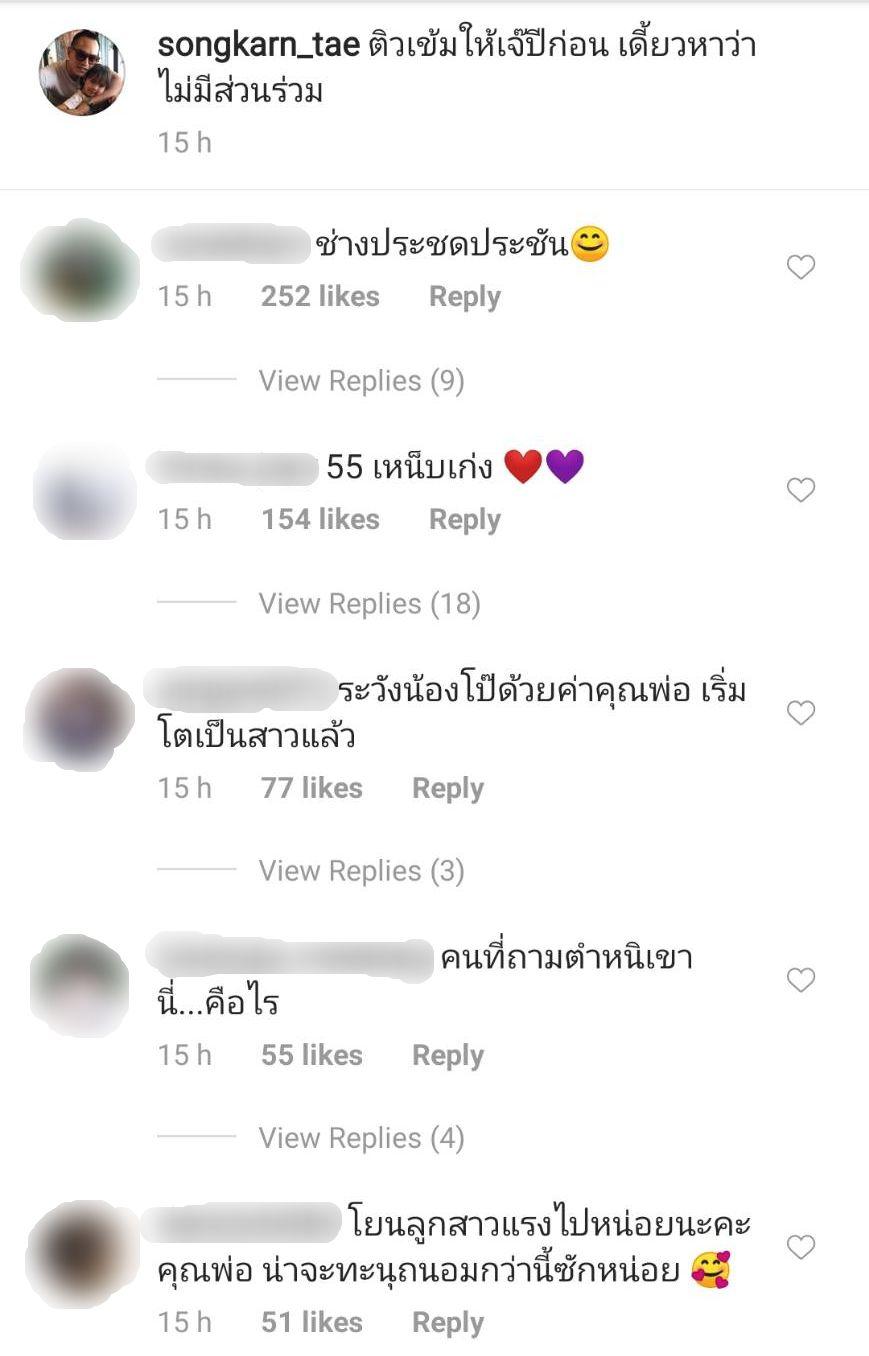 นอกจากนี้ก็มีคนเข้ามาเตือนว่า “ระวังน้องโป๊ด้วยค่าคุณพ่อ เริ่มโตเป็นสาวแล้ว” แต่ก็มีคนคอมเมนต์ตอบกลับว่า “เริ่มสาวเเล้วเหรอ ตรงไหน ยังไร้เดียงสาอยู่เลย” รวมไปถึงคอมเมนต์ที่บอกว่าโยนลูกสาวแรงไป น่าจะทะนุถนอมกว่านี้หน่อย ฯลฯ.