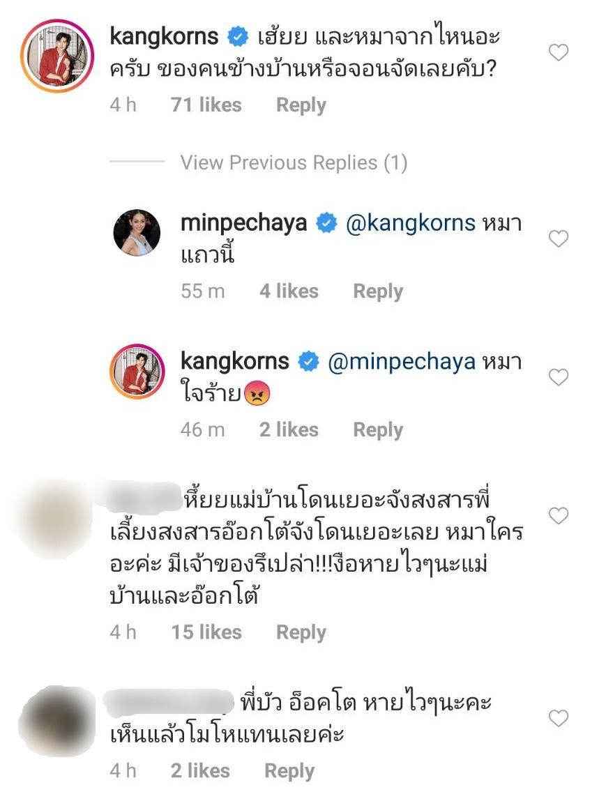 โดยมีแฟนๆ เข้ามาคอมเมนต์ให้กำลังใจ พร้อมทั้งบอกว่าสงสารพี่บัวและอ๊อกโต้มากๆ และขอให้หายเจ็บไวๆ ส่วนคนบันเทิงก็เข้ามาคอมเมนต์ให้กำลังใจเช่นกัน ด้าน กั้ง กรณ์ หรือ กั้ง เดอะสตาร์ คอมเมนต์ถามว่า “เฮ้ยย และหมาจากไหนอะครับ ของคนข้างบ้านหรือจรจัดเลยคับ?” และ มิน ตอบกลับว่า “หมาแถวนี้” ก่อนที่ กั้ง จะตอบกลับว่า “หมาใจร้าย” ด้วย.