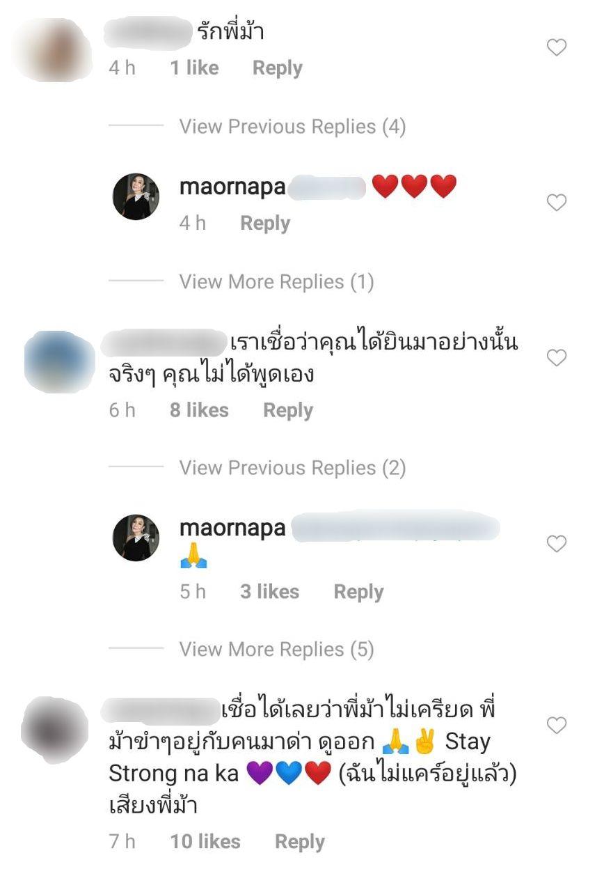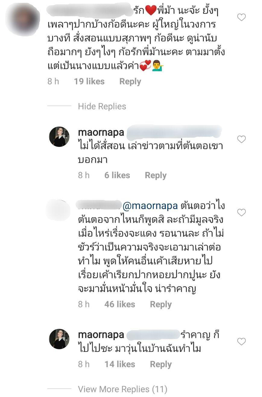 แต่ก็มีดราม่าตามมาอีกระลอก เมื่อมีชาวเน็ตอีกคนบอกว่า “ต้นตอว่าไง ต้นตอจากไหนก็พูดสิ ละถ้ามีมูลจริงเมื่อไหร่เรื่องจะแดง รอนานละ ถ้าไม่ชัวร์ว่าเป็นความจริงจะเอามาเล่าต่อทำไม พูดให้คนอื่นเค้าเสียหายไปเรื่อยเค้าเรียกปากหอยปากปูนะ ยังจะมามั่นหน้ามั่นใจ น่ารำคาญ” ซึ่ง ม้า ก็ตอบกลับไปว่า “รำคาญ ก็ไปไปซะ มาวุ่นในบ้านฉันทำไม” จากนั้นก็มีชาวเน็ตอีกหลายคนเข้ามาคอมเมนต์วิจารณ์ถึงพิธีกรดังด้วยถ้อยคำรุนแรงด้วย.