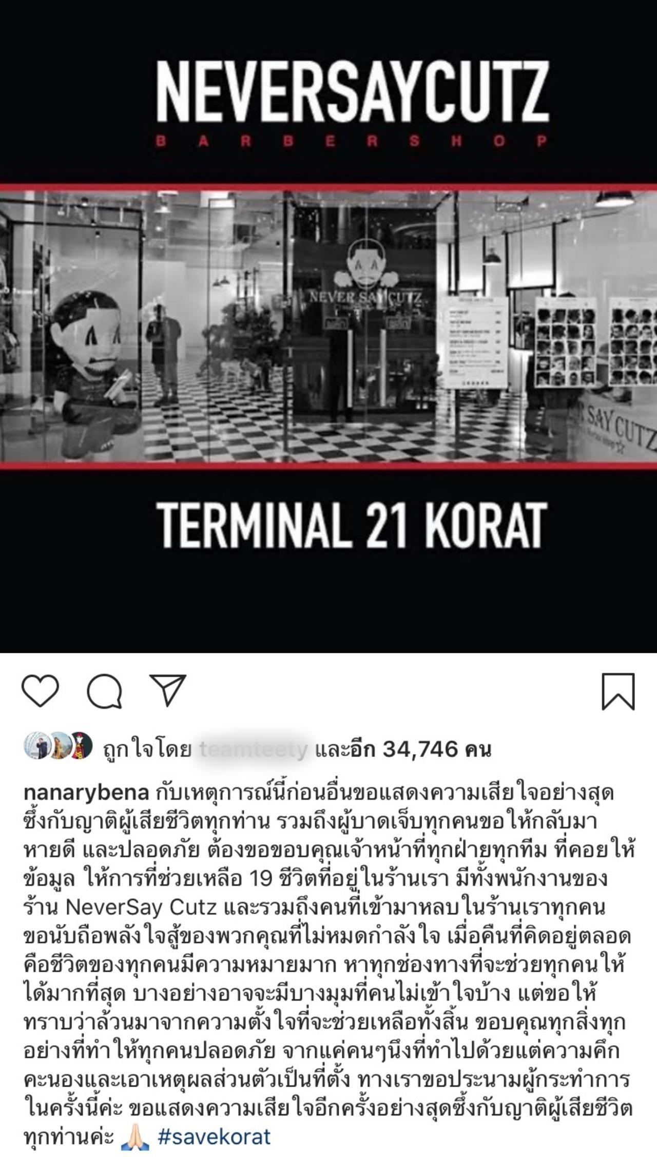 ยังคงเป็นเหตุการณ์ที่ทำเอาคนไทยทั้งประเทศรู้สึกขวัญผวาไม่หาย เมื่อมีคนร้ายกราดยิงผู้คนที่ จ.นครราชสีมา จนทำให้มีผู้เสียชีวิตเป็นจำนวนมาก ซึ่งคนร้ายได้เข้าไปในห้างดังเพื่อก่อเหตุซ้ำ ซึ่งในห้างดังกล่าวมีร้านตัดผม NeverSay Cutz ของ นานา ไรบีน่า ซึ่งเจ้าตัวได้โพสต์ข้อความผ่านทางอินสตาแกรมของตัวเอง หลังจากที่เจ้าหน้าที่สามารถเคลียร์ทุกอย่างเสร็จเรียบร้อยว่า