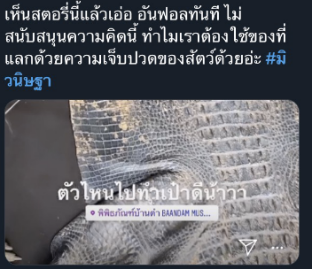 เรียกว่าดราม่าสนั่น เมื่อนางเอกเจ้าสาวป้ายแดง มิว นิษฐา โพสต์สตอรี่ไอจีเป็นภาพหนังจระเข้หลายตัวพร้อมข้อความ "ตัวไหนไปทำเป๋าดีน้า" ซึ่งข้อความนี้ทำให้ในโซเชียลมีการวิพากษ์วิจารณ์กันอย่างมากมายว่าไม่เหมาะสม บ้างก็ว่ามีการรณรงค์มากมายไม่ให้เอาหนังสัตว์มาทำกระเป๋า แต่ดาราคนนี้กลับทำ บ้างก็ว่าผิดหวังที่นางเอกดังระดับต้นๆ ทำไมมีทัศนคติเช่นนี้