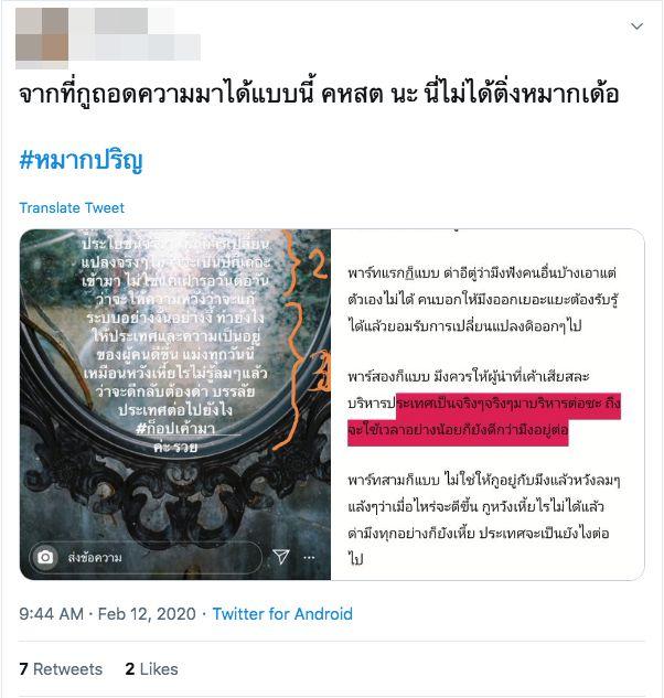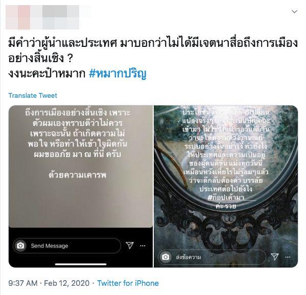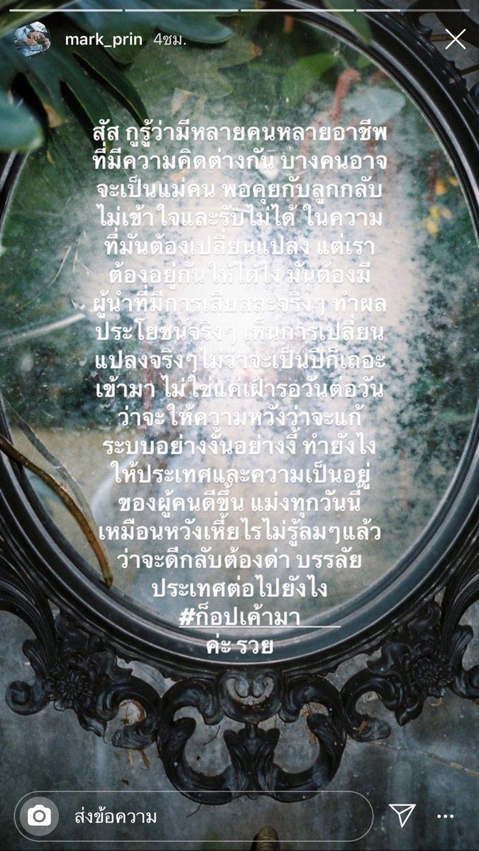 โดยในไอจีสตอรี่ของ หมาก มีข้อความว่า “สั_ กูรู้ว่ามีหลายคนหลายอาชีพที่มีความคิดต่างกัน บางคนอาจจะเป็นแม่คน พอคุยกับลูกกลับไม่เข้าใจและรับไม่ได้ ในความที่มันต้องเปลี่ยนแปลง แต่เราต้องอยู่กันให้ได้ไง มันต้องมีผู้นำที่มีการเสียสละจริงๆ ทำผลประโยชน์จริงๆ เห็นการเปลี่ยนแปลงจริงๆ ไม่ว่าจะเป็นปีก็เถอะ เข้ามา ไม่ใช่แค่เฝ้ารอวันต่อวันว่าจะให้ความหวังว่าจะแก้ระบบอย่างงั้นอย่างงี้ ทำยังไงให้ประเทศและความเป็นอยู่ของผู้คนดีขึ้น แม่_ทุกวันนี้เหมือนหวังเหี้_ไรไม่รู้ลมๆ แล้วว่าจะดีกลับต้องด่า บรรลัยประเทศต่อไปยังไง #ก็อปเค้ามาค่ะ รวย”