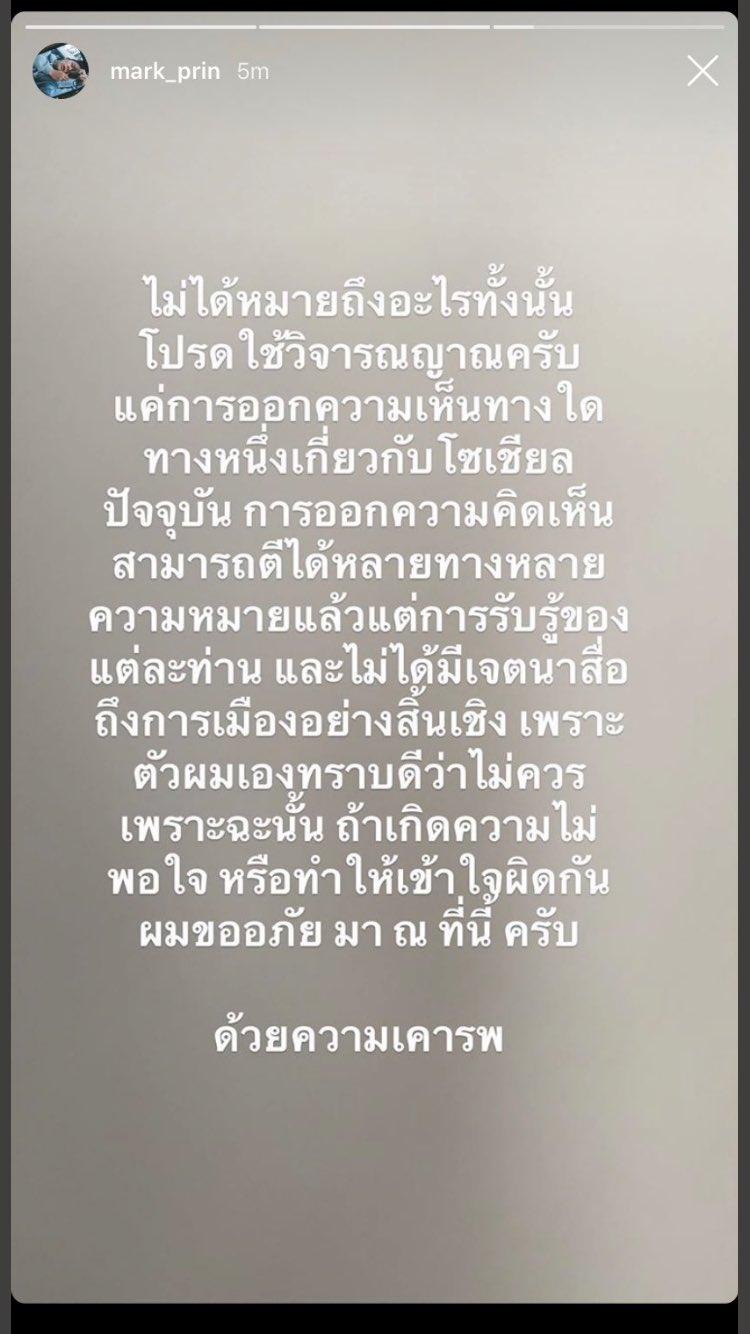 แต่หลังจากนั้นพระเอกหนุ่มก็ได้ลบภาพข้อความดังกล่าวทิ้ง และโพสต์ไอจีสตอรี่ใหม่ว่า “ไม่ได้หมายถึงอะไรทั้งนั้น โปรดใช้วิจารณญาณครับ แค่การออกความเห็นทางใดทางหนึ่งเกี่ยวกับโซเชียลปัจจุบัน การออกความคิดเห็นสามารถตีได้หลายทางหลายความหมาย แล้วแต่การรับรู้ของแต่ละท่าน และไม่ได้มีเจตนาสื่อถึงการเมืองอย่างสิ้นเชิง เพราะตัวผมเองทราบดีว่าไม่ควร เพราะฉะนั้น ถ้าเกิดความไม่พอใจ หรือทำให้เข้าใจผิดกัน ผมขออภัยมา ณ ที่นี้ครับ ด้วยความเคารพ”