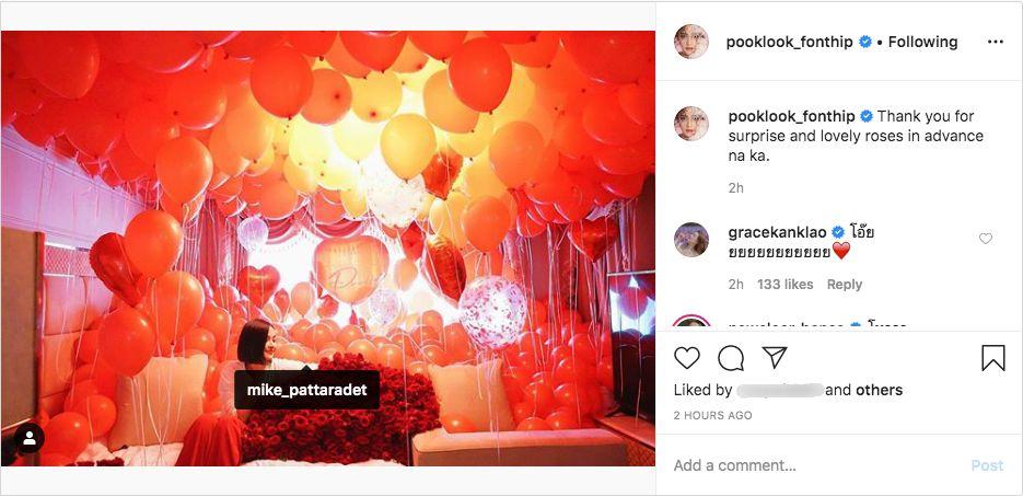 ล่าสุด ไมค์ ทำเซอร์ไพรส์ ปุ๊กลุก แบบจัดหนักจัดเต็ม ด้วยดอกกุหลาบสีแดงนับร้อยดอก รวมไปถึงลูกโป่งสวยๆ เต็มห้อง ซึ่งเป็นการทำเซอร์ไพรส์วันวาเลนไทน์ล่วงหน้า เพราะในวันพรุ่งนี้ (14 ก.พ. 63) ปุ๊กลุก ต้องเดินทางไปทำงานที่ประเทศอังกฤษพอดี โดย ปุ๊กลุก โพสต์ภาพพร้อมทั้งแท็กไปที่ไอจีของ ไมค์ และเขียนข้อความว่า “Thank you for surprise and lovely roses in advance na ka.”