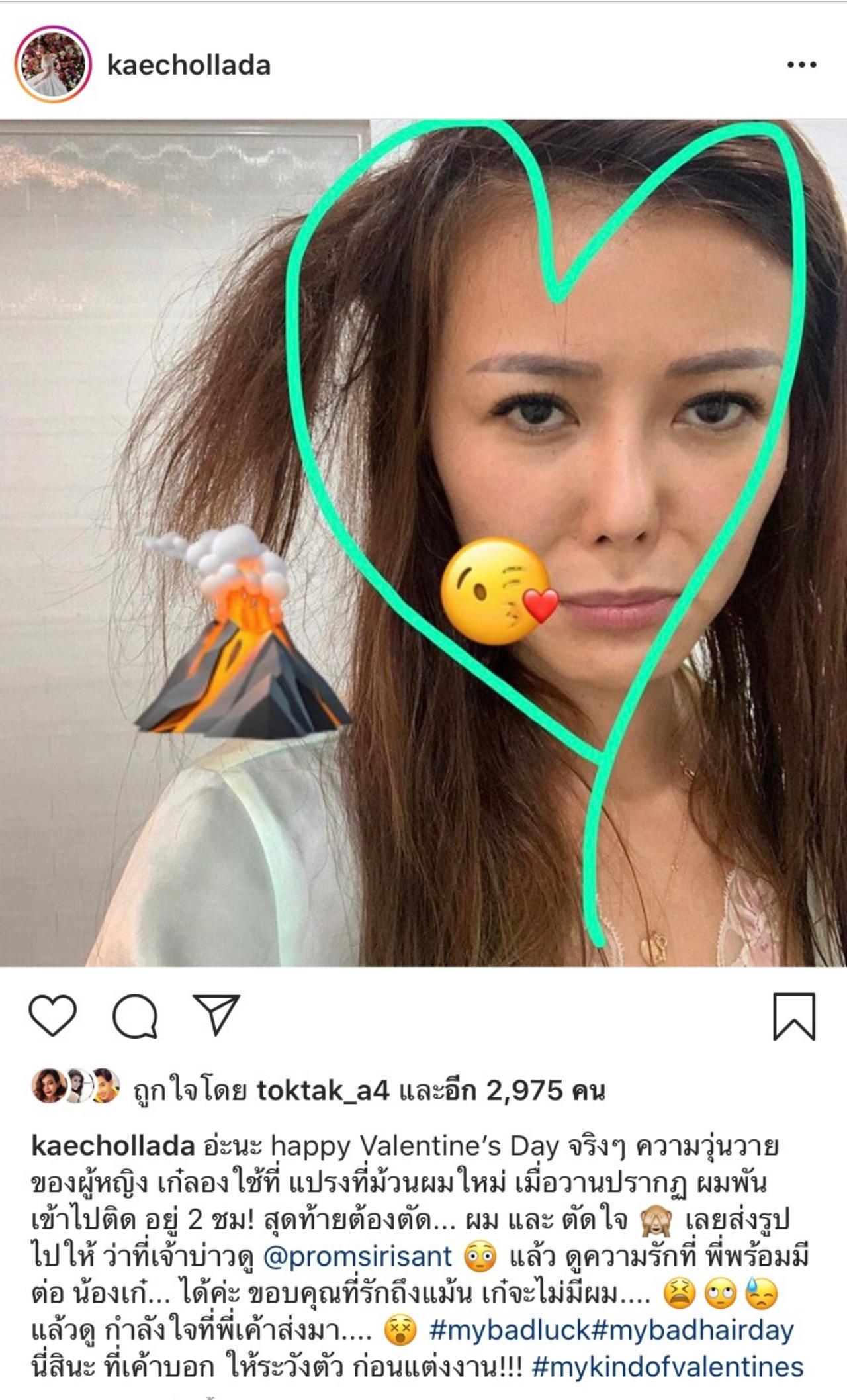 “อ่ะนะ happy Velentine’s Day จริงๆ ความวุ่นวายของผู้หญิง เก๋ลองใช้ที่แปรงม้วนผมใหม่ เมื่อวานปรากฏผมพันเข้าไปติดอยู่ 2 ชม.! สุดท้ายต้องตัดผม และ ตัดใจ เลยส่งรูปไปให้ว่าที่เจ้าบ่าวดู แล้วดูความรักที่พี่พร้อมมีต่อน้องเก๋ ได้ค่ะ ขอบคุณที่รักถึงแม้นเก๋จะไม่มีผม แล้วดูกำลังใจที่พี่เค้าส่งมา นี่สินะ ที่เค้าบอกให้ระวังตัวก่อนแต่งงาน!!!” งานนี้เพื่อนๆ และชาวเน็ตก็เข้าไปคอมเมนต์ให้กำลังใจว่าที่เจ้าสาวกันอย่างล้นหลาม รวมถึงว่าที่สามีก็ให้กำลังใจว่าถึงยังไงก็รัก