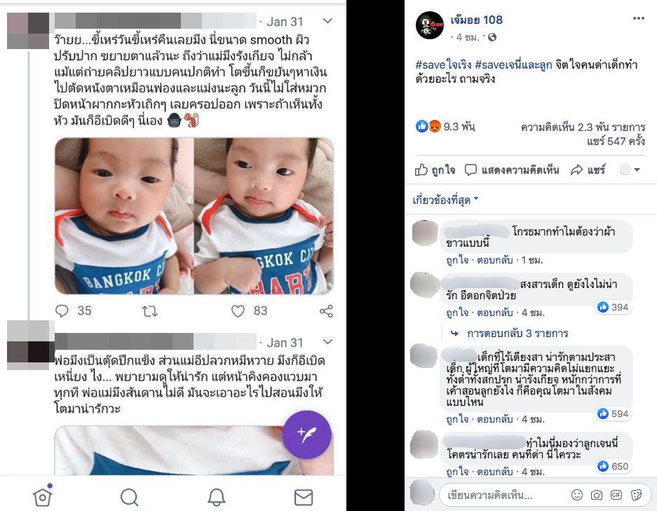 แต่ล่าสุดในโลกโซเชียลเกิดดราม่าเดือด เมื่อมีผู้ใช้ทวิตเตอร์รายหนึ่งโพสต์ภาพ น้องโนล่า พร้อมทั้งเขียนข้อความบูลลี่วิจารณ์หนูน้อย อาทิ ขี้เหร่วันขี้เหร่คืน หัวเถิก หน้าคิงคอง และบอกว่านางเอกสาวใช้แอปแต่งรูปลูก แถมยังวิจารณ์ว่าพ่อแม่สันดา_ไม่ดี จะเอาอะไรไปสอนให้โตมาน่ารัก ซึ่งเพจดัง เจ๊มอย 108 แคปเจอร์ภาพและข้อความมาลง พร้อมทั้งเขียนข้อความว่า “#saveใจเริง #saveเจนี่และลูก จิตใจคนด่าเด็กทำด้วยอะไร ถามจริง”